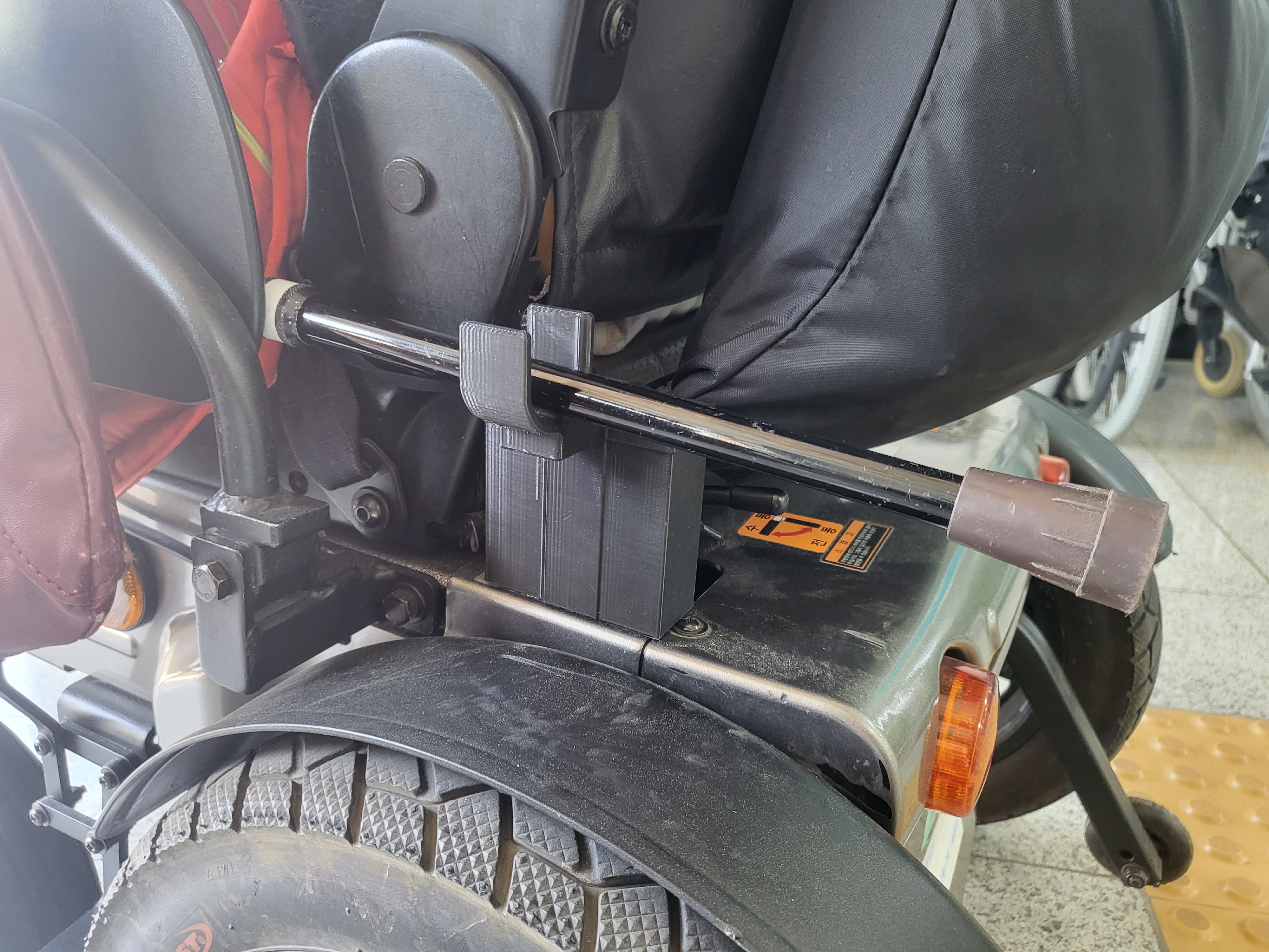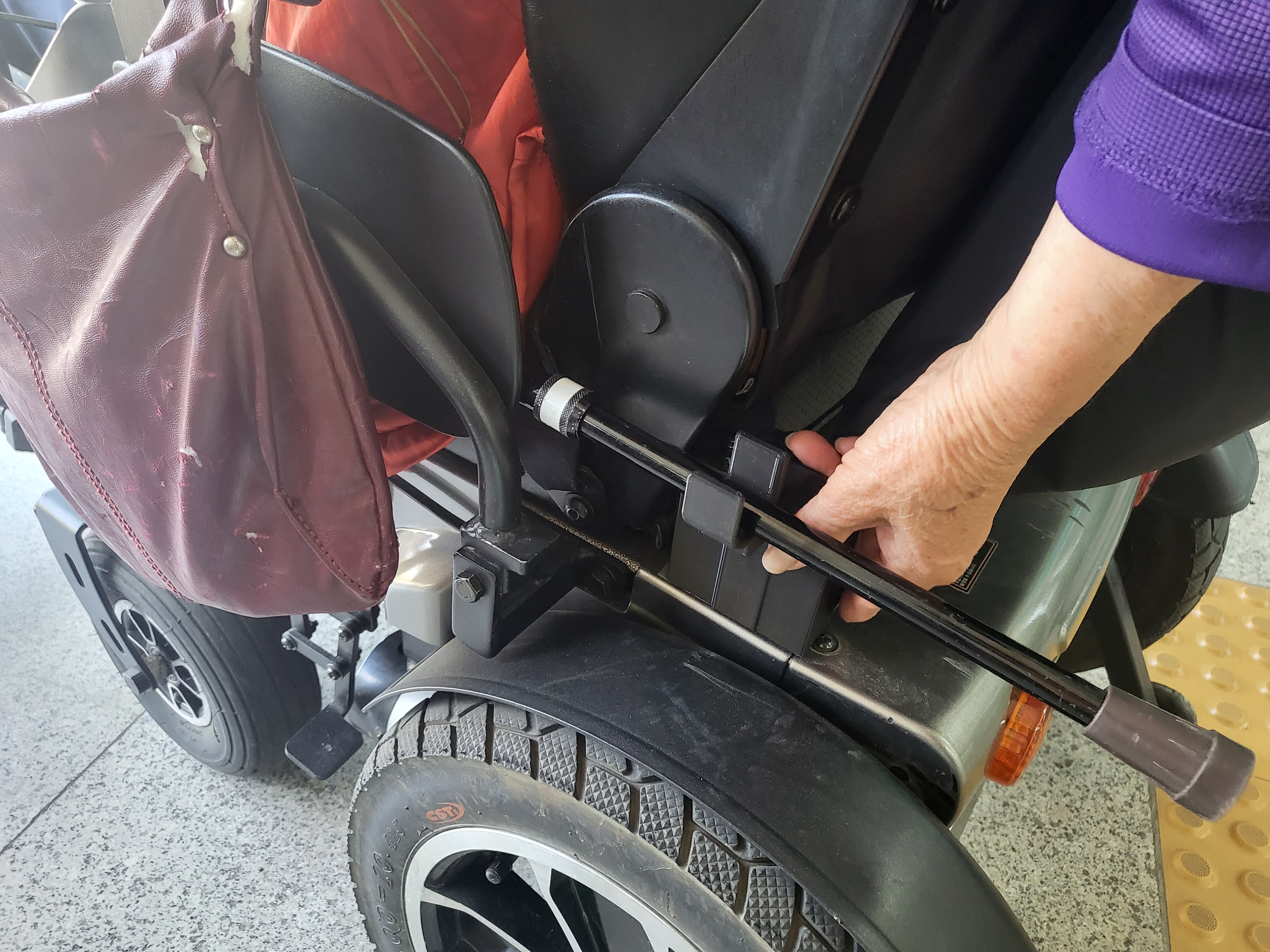 평소 지팡이를 팔걸이 프레임과 시트프레임 사이에 두고 전동스쿠터로 이동하시는데 지팡이가 빠지는 경우가 많아 바퀴에 닿여 사고가 날뻔한 적이 많았었으나, 현재는 그러한 문제가 해결되어 높은 만족감을 보임.