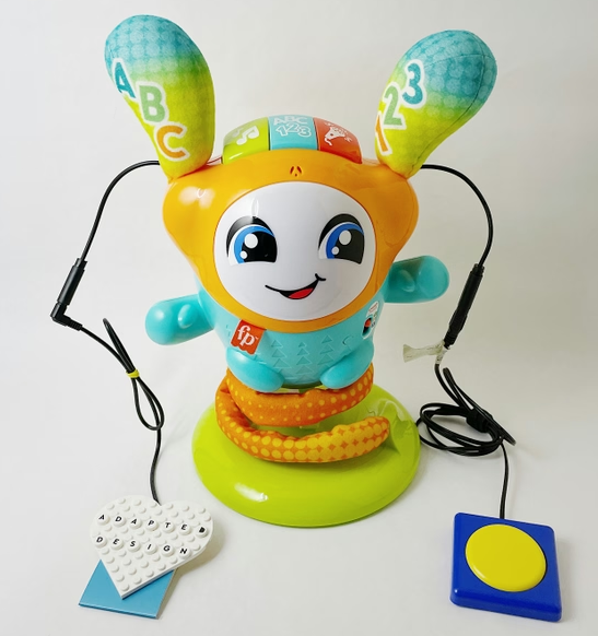 그림1. 일부 사용자가 더 쉽게 상호작용할 수 있도록, 두 개의 외부 적응형 스위치가 연결된 장난감.