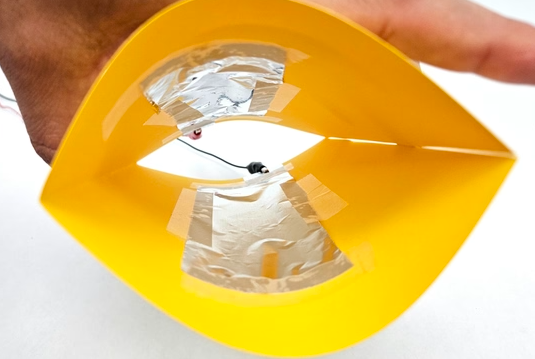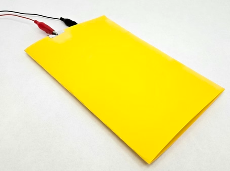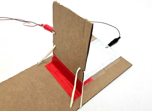 평상시에는 두 장의 종이가 약간 벌어진 곡선을 이루고 있어 알루미늄 포일 사이에 간격이 존재합니다. 종이를 아래로 누르면 이 간격이 닫히면서 두 알루미늄 포일이 서로 닿게 되고, 손을 떼면 종이가 다시 약간 휘어진 원래 형태로 되돌아가면서 간격이 다시 열립니다.