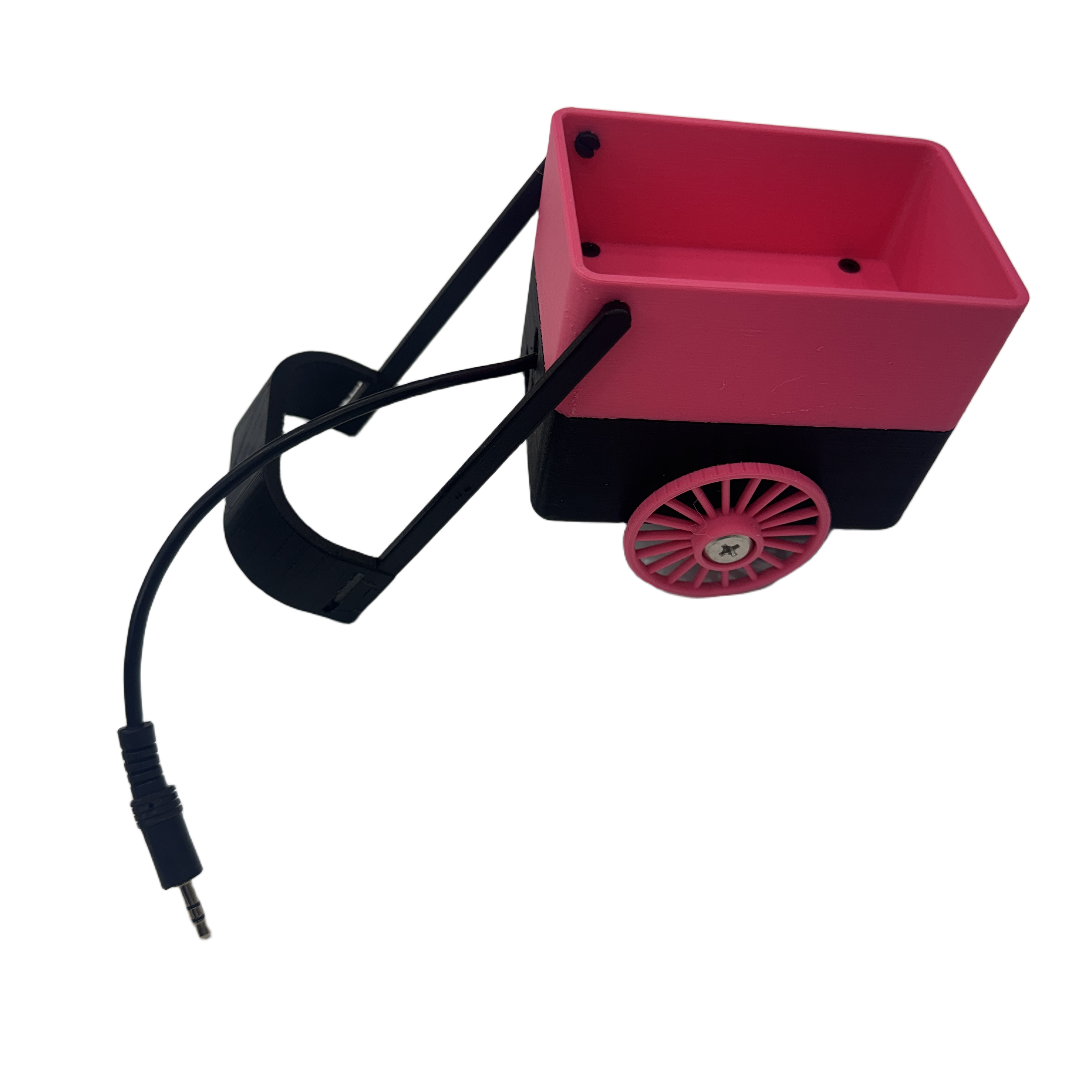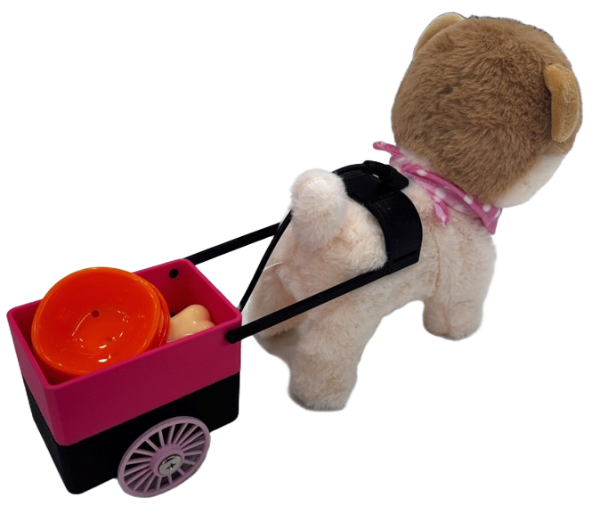 ② 수신기 디자인 – 장난감과 자연스럽게 어울리게 수신기는 무선신호를 받아 스위치를 대신 눌러주는 동작이 필요했기 때문에, 통신 모듈과 전원, MOSFET 회로 등 여러 구성 요소가 들어갔습니다. 완성하고 보니 생각보다 크기가 컸었고, 이를 바로 장난감 외부에 붙이면 외형적으로 위화감이 생길 수 있다는 점이 고민이었습니다. 이 문제를 해결하기 위해 강아지 장난감에 장착할 수 있는 작은 짐수레 형태의 케이스를 만들고, 그 안에 수신기 장치를 넣어 감추는 구조로 설계했습니다. 장난감의 이미지와 잘 어울리면서도 내부 장치가 눈에 띄지 않아 안정감 있게 사용할 수 있었습니다.
