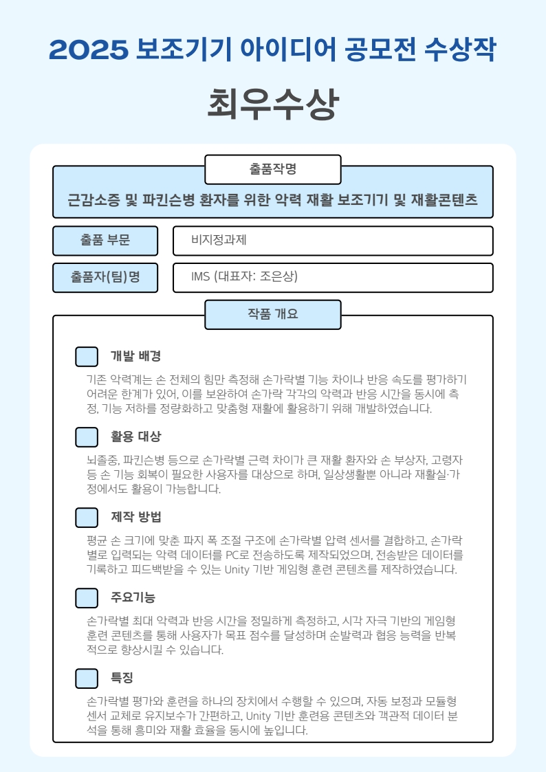[2025년 공모전 수상작 - 최우수상] 근감소증 및 파킨슨병 환자를 위한 악력 재활 보조기기 및 재활콘텐츠