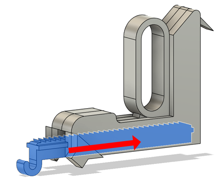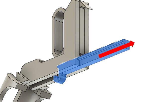 3. 본체와 레일 결합 본체와 톱니 레일을 연결한다. 레일은 톱니가 위쪽을 향하도록 하여 본체 전면에서 삽입하며, 레일의 길이는 이후 과정에서 자동으로 조절되므로 과도하게 밀어 넣지 않도록 한다. | |
