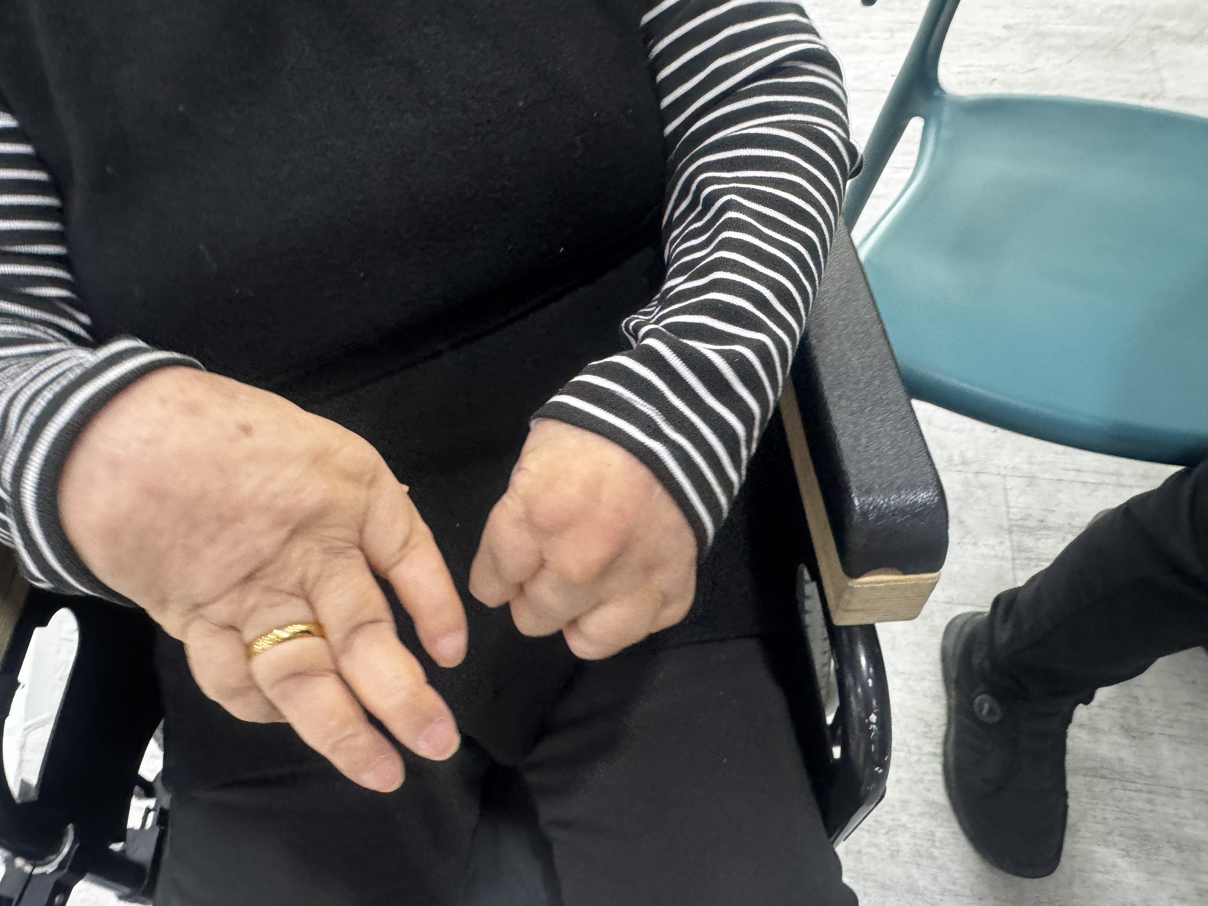 3. 세부정보: 구축으로 인해 양측 팔 길이에 차이가 있음. 기성품 의류를 입었을 때 양측이 다른점과 길이가 과하게 긴 점이 불편함