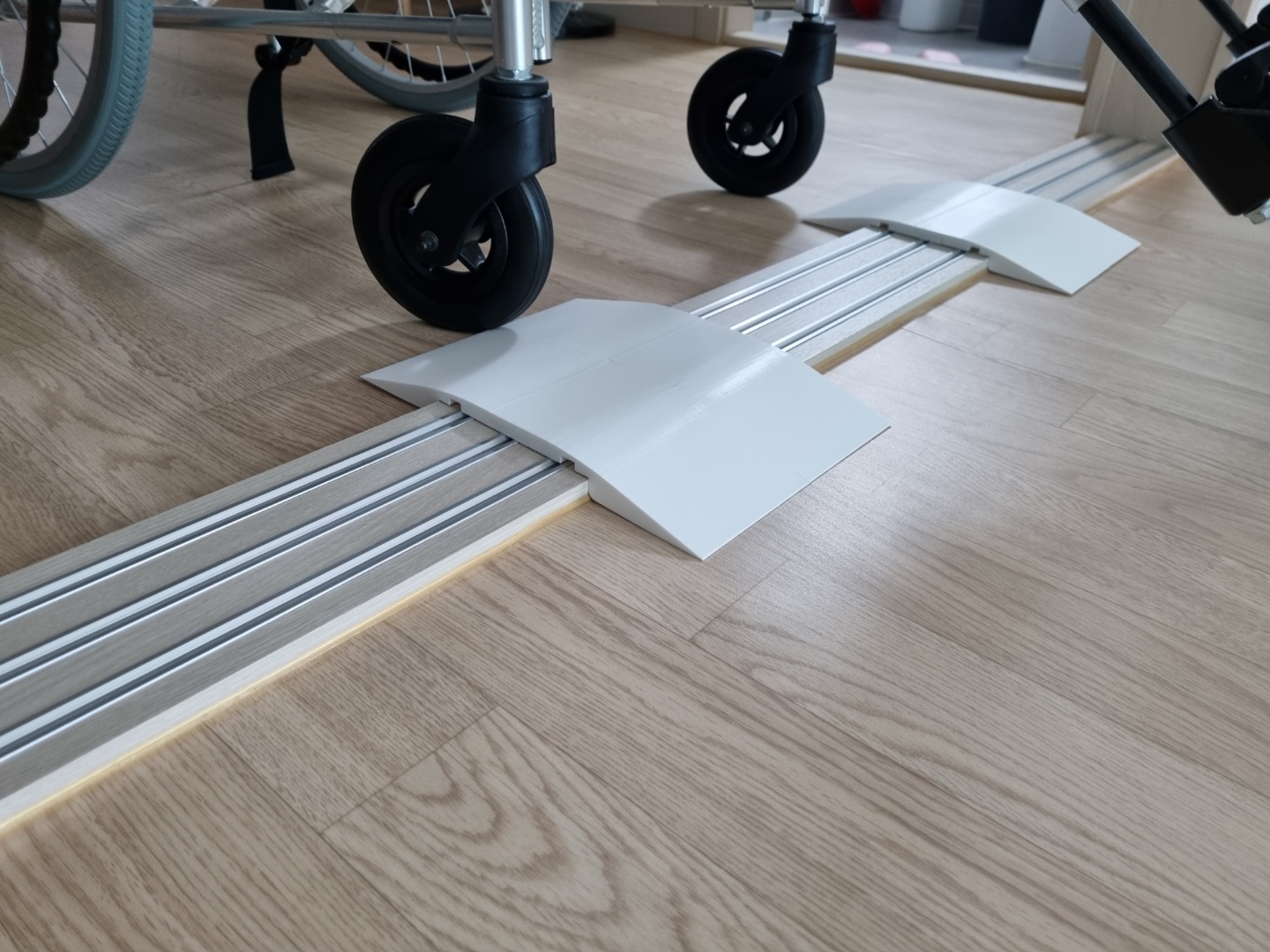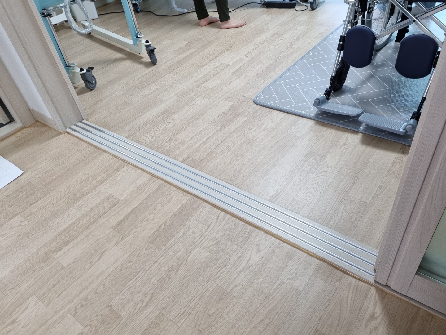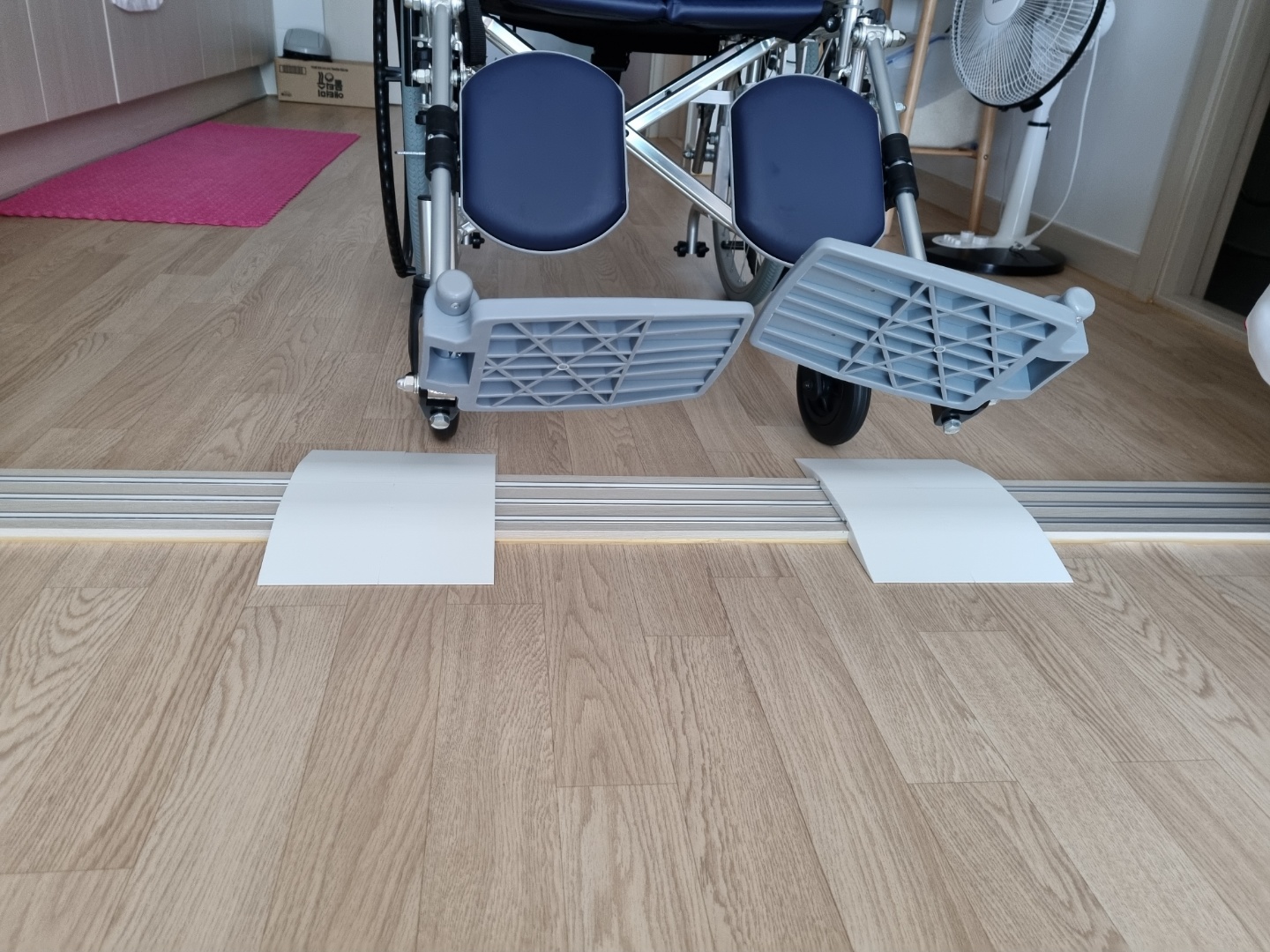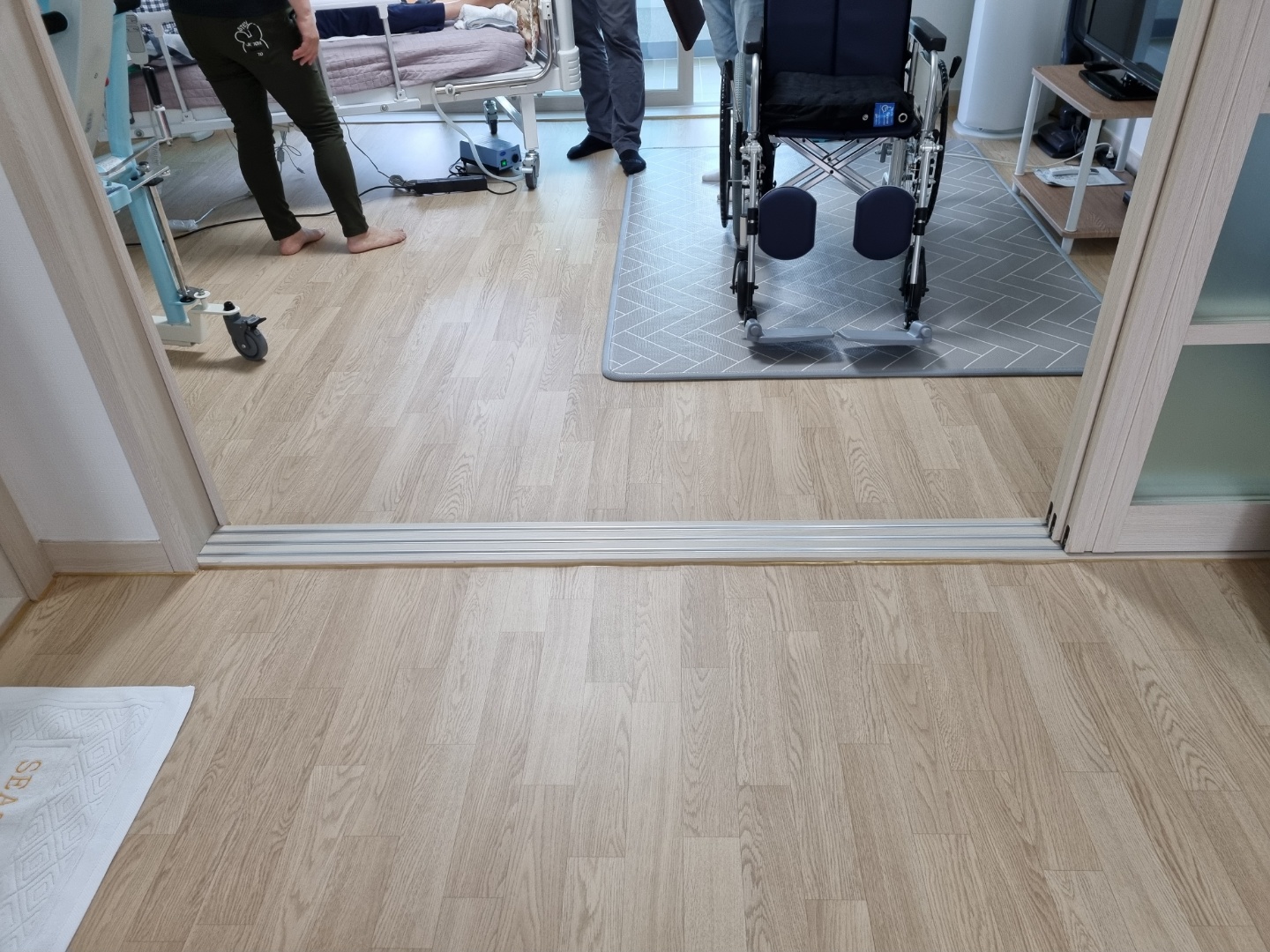 욕구: 최근 이동식전동리프트와 리클라이닝 수동휠체어를 지원받아 사용하기 시작하였으나, 문턱으로 인해 이동과 사용에 어려움을 겪고 있음. 문턱에 경사로를 설치하여 이를 해결하기를 희망하였음. 추가로 문틀과 바닥재의 손상이 가지 않으면서 경사로가 움직이지 않고 잘 고정되기 희망함. 향후 전동휠체어도 사용하고자 함.
