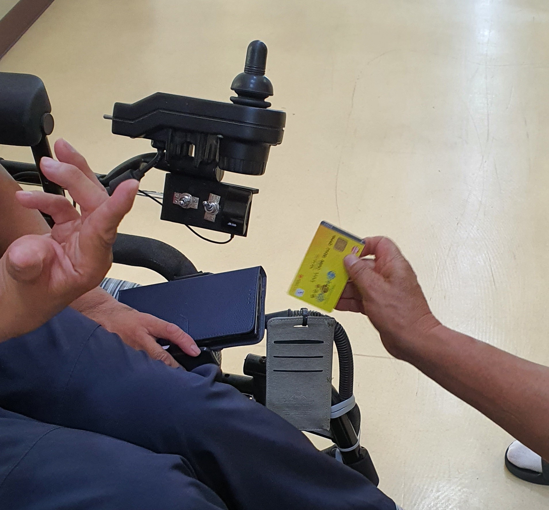 진00님은 전동휠체어에 다양한 편의 장치를 부착해서 사용하고 계셨는데, 전동휠체어 배터리에 차량용 시거잭을 연결하여 사용하는 통풍시트와 휴대폰 블루투스 장치, 주름관 타입의 스마트폰 거치대, 장애인 콜택시를 이용할 때 편리한 복지카드용 지갑 등입니다.
