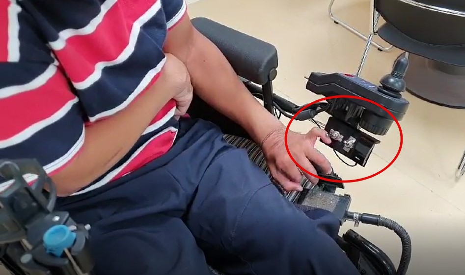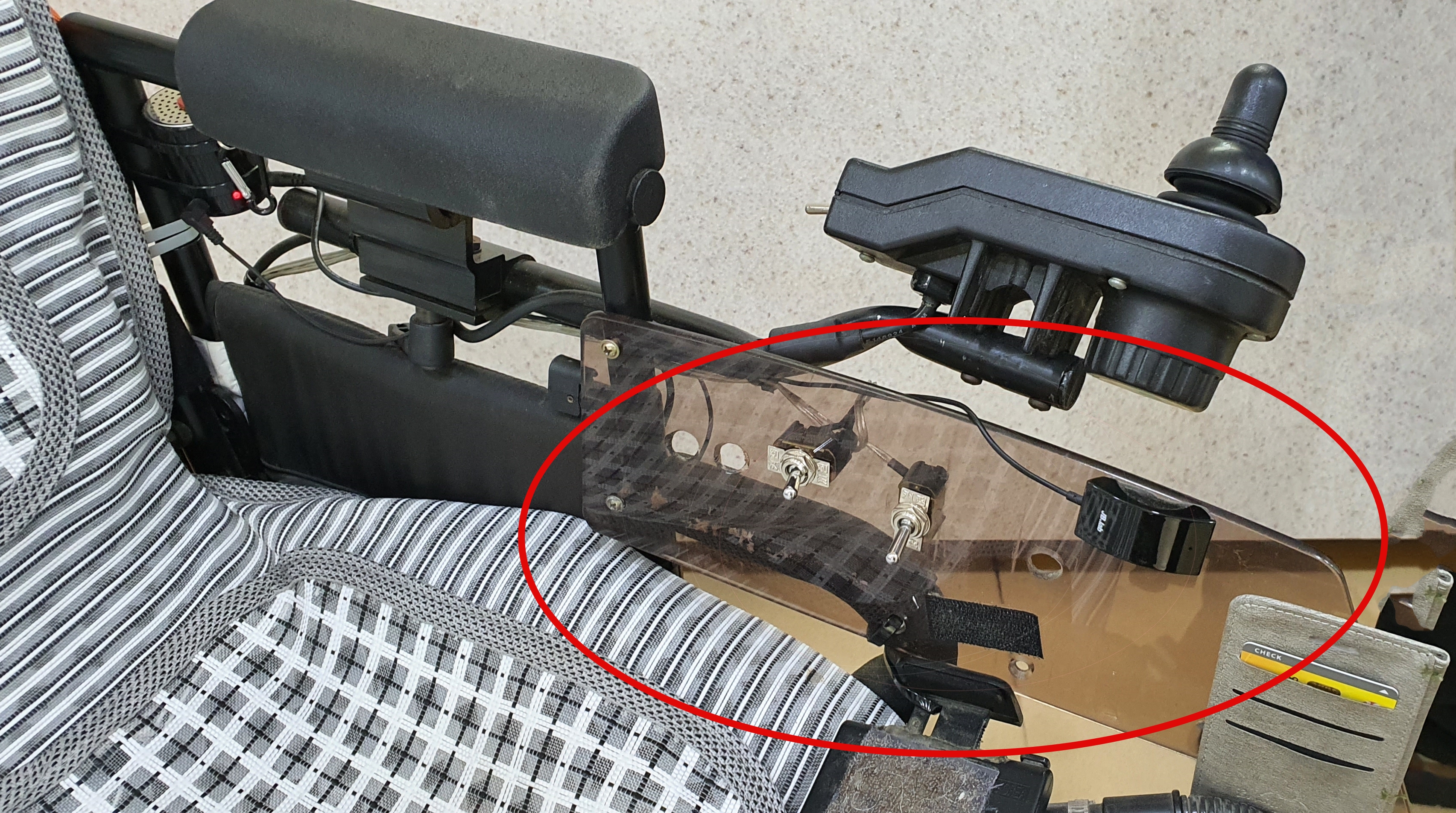 ▼ 적용 전 이에 저희 센터에서 전동휠체어 컨트롤러 아래에 부착할 수 있는 스위치 브라켓을 3D 프린터로 제작해 드렸습니다.