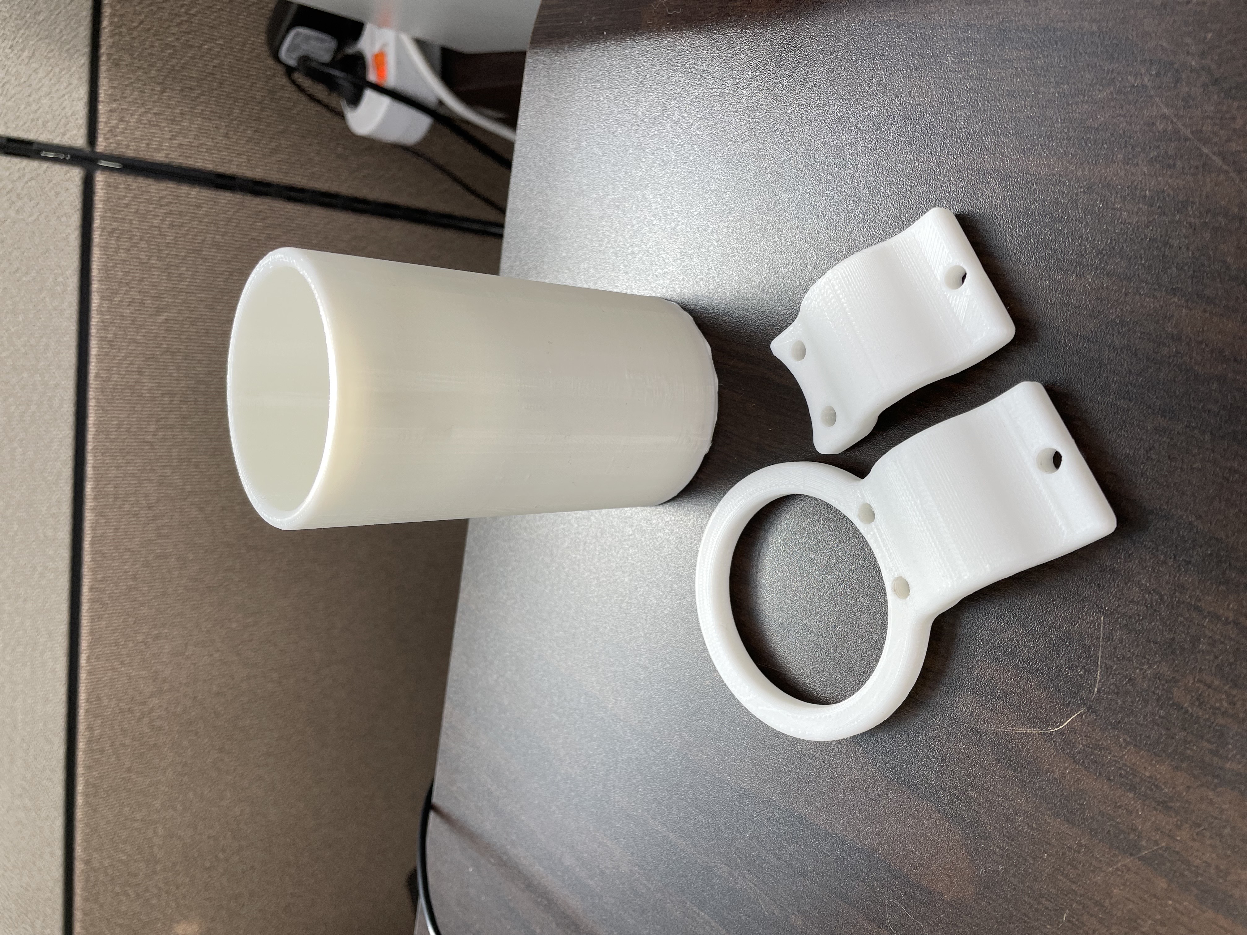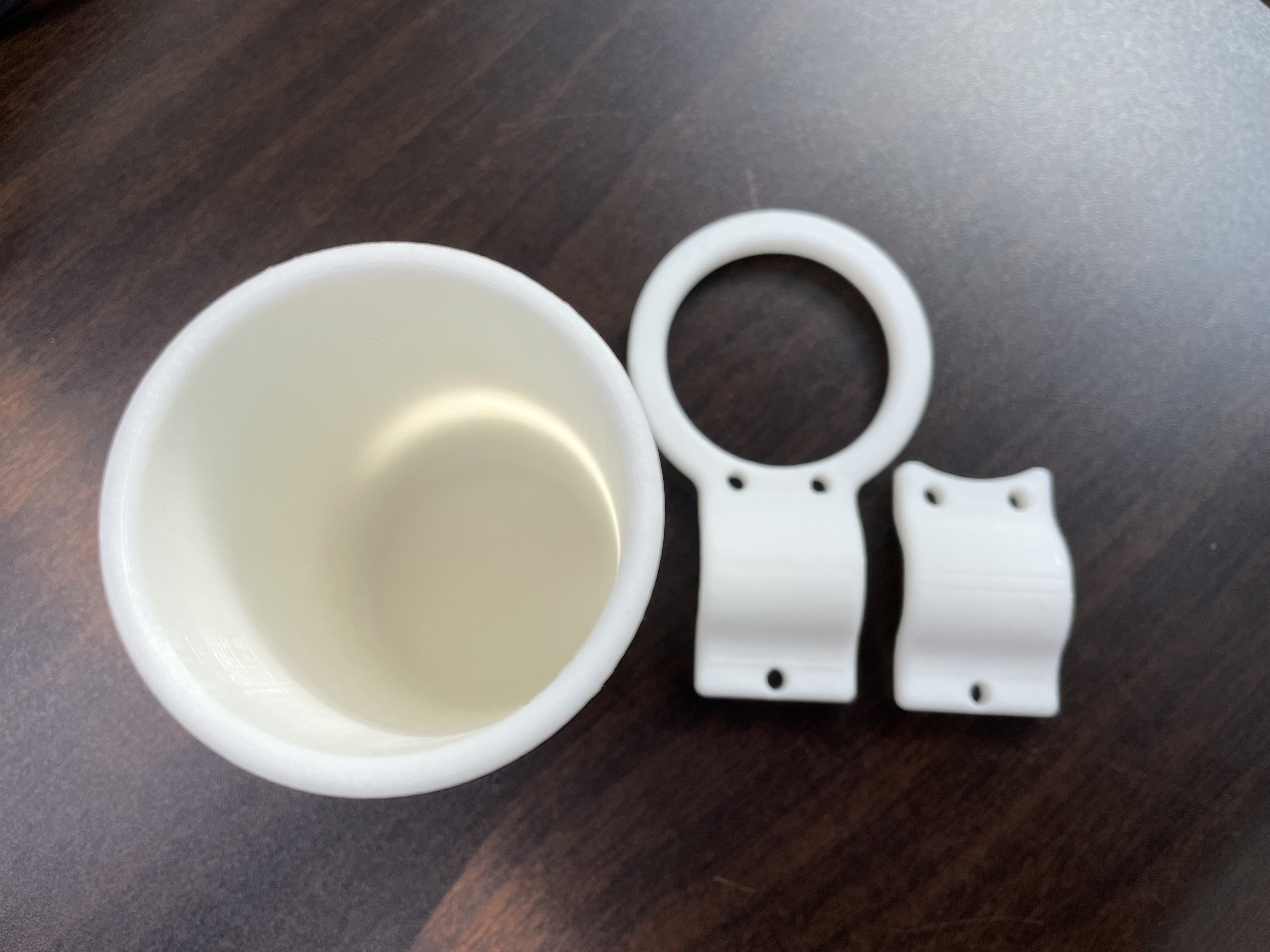 상부는 도넛 형태로 지팡이를 넣을 수 있게 제작하였고, 하부는 지팡이의 팁(끝부분)이 미끄러지지 않게 원통형 거치대를 부착하였음.