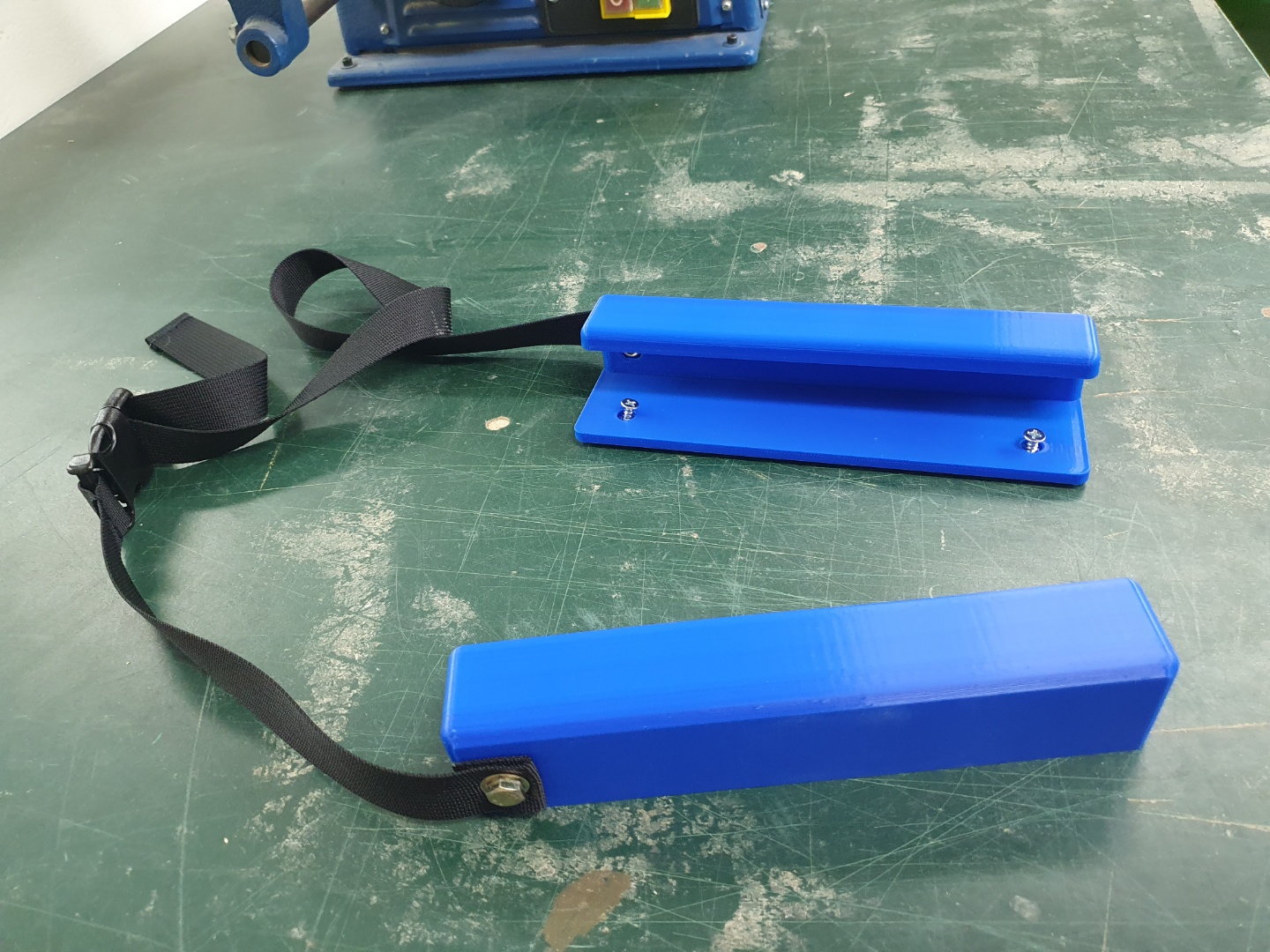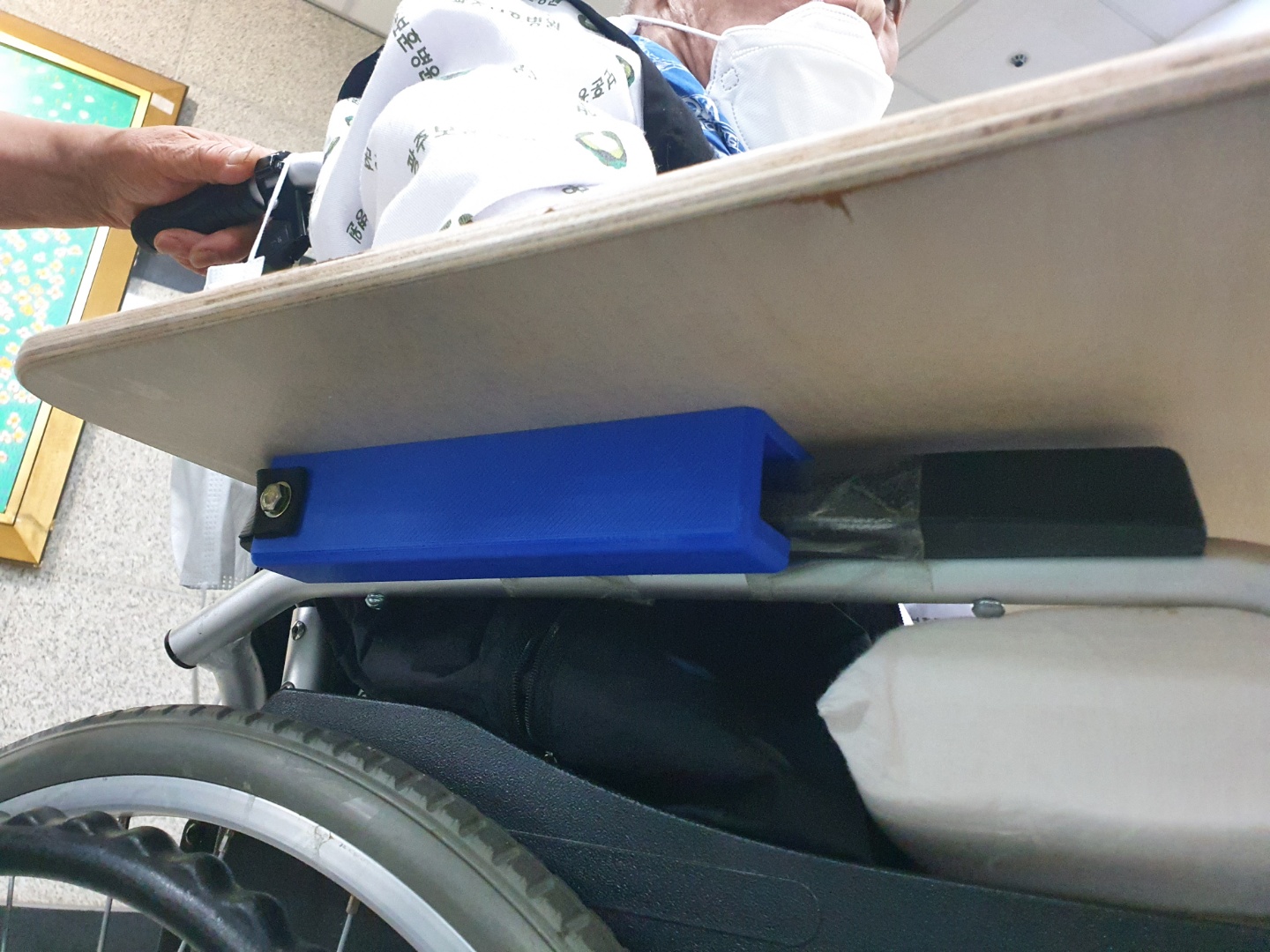 ▶ 제작 과정 - 휠체어 사이즈에 맞게 랩보드 제작 - 볼트 고정형 브라켓 형태로 1차 적용을 진행함 - 사용 도중 브라켓이 파손되어 두께와 고정방식 수정