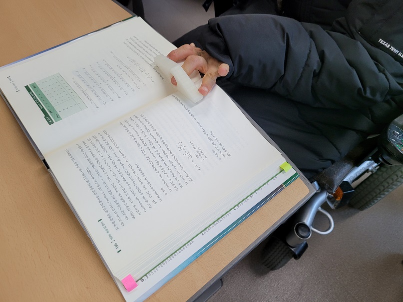 - 전공 도서 및 일반 도서를 자주 읽어야 하는 학생. - 특히 전공 도서의 경우는 두꺼운 책이 많아 한 손으로 잡고 있지 않으면 책이 넘어가거나 덮혀버리는 상황이 자주 발생함. - 또한 일상생활에서 병을 따는 등의 행동이 쉽지 않아 항상 활동보조인이나 타인의 도움을 받아야만 가능.