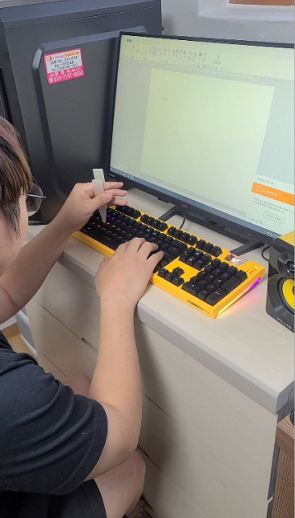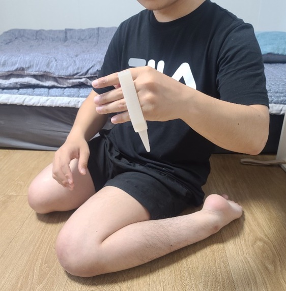 - 양손으로 키보드를 입력할 수 있도록 왼쪽 손에 사용할 수 있는 타이핑 보조기기 적용. - 왼손으로로 키보드를 입력할 수 있게 되었으나 양손의 협응 동작(왼손은 타이핑 보조기기, 오른손은 맨손)이 매끄럽지 못함. - 이 부분은 지속적인 훈련 및 연습 등을 통해 보완해야 될 점으로 판단됨. - 왼손의 구축으로 정확한 타이핑을 하기 어려웠으나 느린 속도로나마 타이핑을 칠 수 있게 됨.