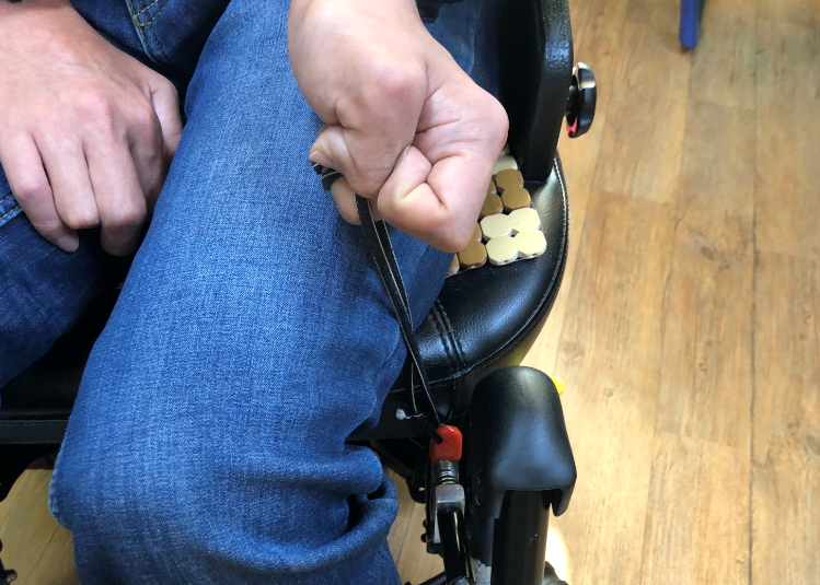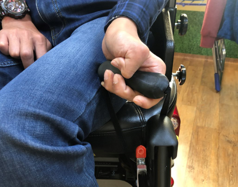 ▣ 대상자 정보 - 만 42세 남성 / 뇌병변 장애 (심한) - 경직형 뇌성마비, 전동휠체어를 사용함. - 과도한 근긴장으로 인해 불수의적인 수축이 발생함. 이로 인해 전동휠체어 탑승 시에 사용할 수 있는 안전손잡이 제작을 의뢰.