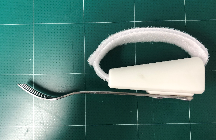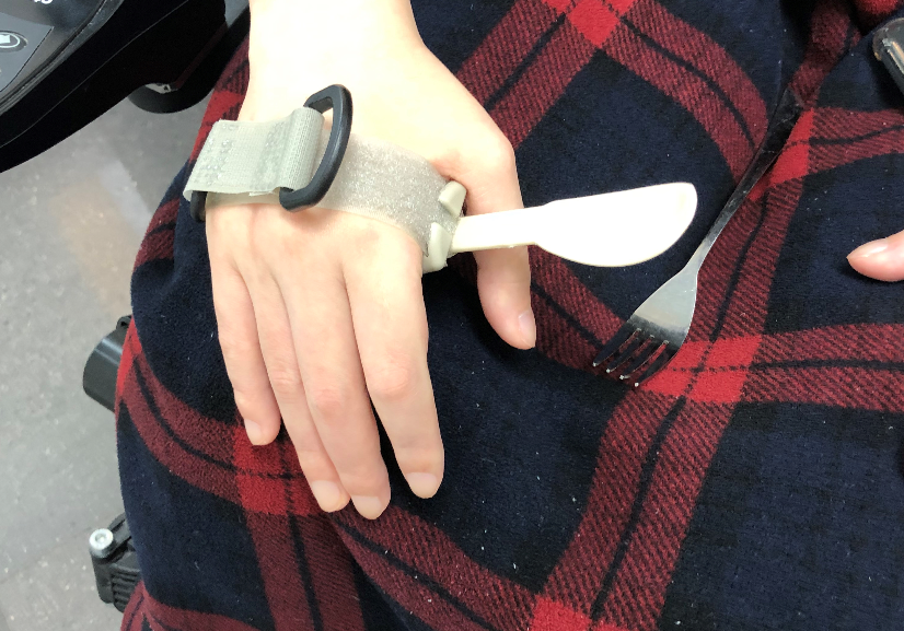 ▣ 평가 - 시중에 판매되고 있는 식사보조기기와 마찬가지로 벨크로를 활용 및 가벼운 수저를 활용할 것을 요구함. - 근이영양증으로 인해 대부분의 근육이 굳어가는 중이며, 진행성 신체 기능 저하로, 최근 대부분의 일상생활동작을 독립적으로 수행하는 것에 어려움을 느낌.