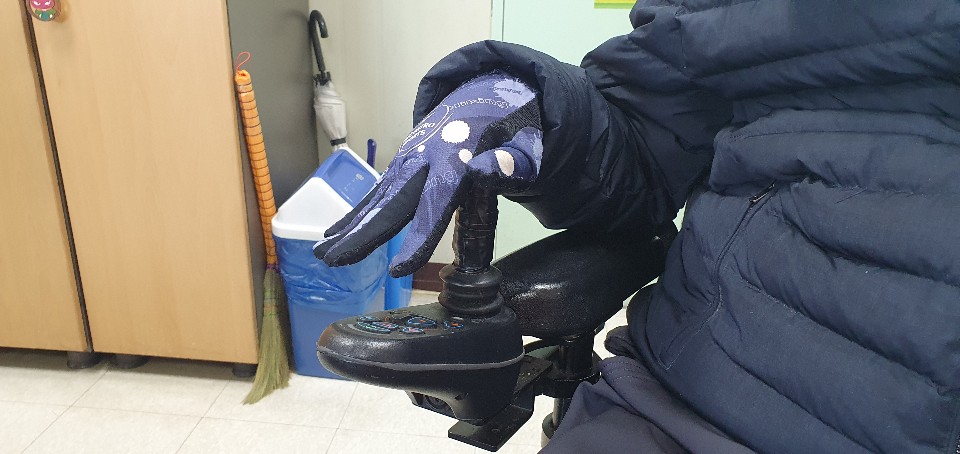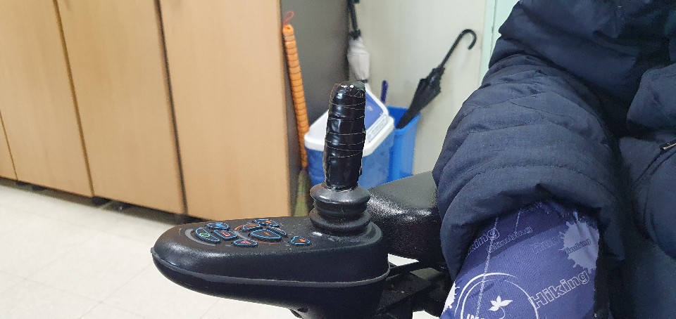 ▶ 적용 전 - 전동휠체어에 기본적으로 장착되어 있는 조이스틱 팁을 개조하여 손바닥으로 조종하고 있음