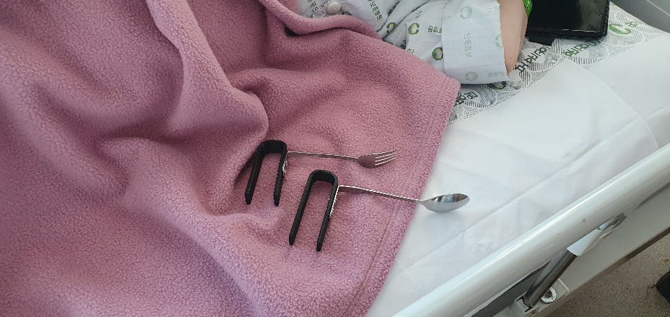 ▶ 적용 후 - 대상자의 손 사이즈와 팔 거상 높이를 측정하여 제작 - 독립적으로 식사 가능하게 됨 - 만족도 조사 결과 디자인 및 기능성, 간편한 사용 등에 만족함 - 추후 사용실태 및 불편사항 점검 예정 |
