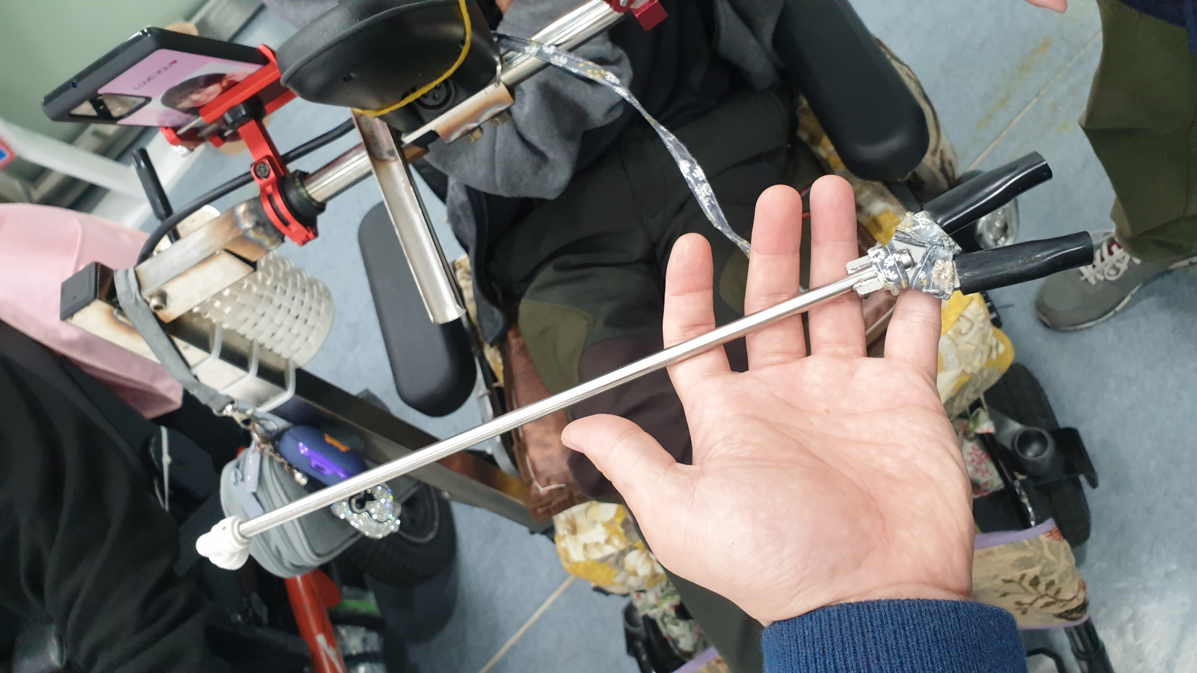 신청자는 뇌성마비를 가지고 있으면서 신체 전반의 강직과 구축으로 독립적인 생활을 수행하는데 제한이 있었으나 머리로 마우스 스틱과 터치펜으로 전동휠체어와 휴대폰을 자유자재로 사용하고 있었음. 기존에 사용하고 있는 마우스스틱의 경우 스틸로 제작되어져 있있었으며 선택과 조작이 사용자에게 최적화되어져 있었음. 하지만 입으로 무는 부분이 전기 테이프로 감겨져 있어 위생에 문제가 있었으며, 이빨로 마우스스틱을 물고 있으면서 충격과 강직으로 인한 힘으로 이와 잇몸에 통증이 지속죄고 있었음. 이에 센터로 부드러운 재질의 마우스 스틱의 제작을 요청하였음.