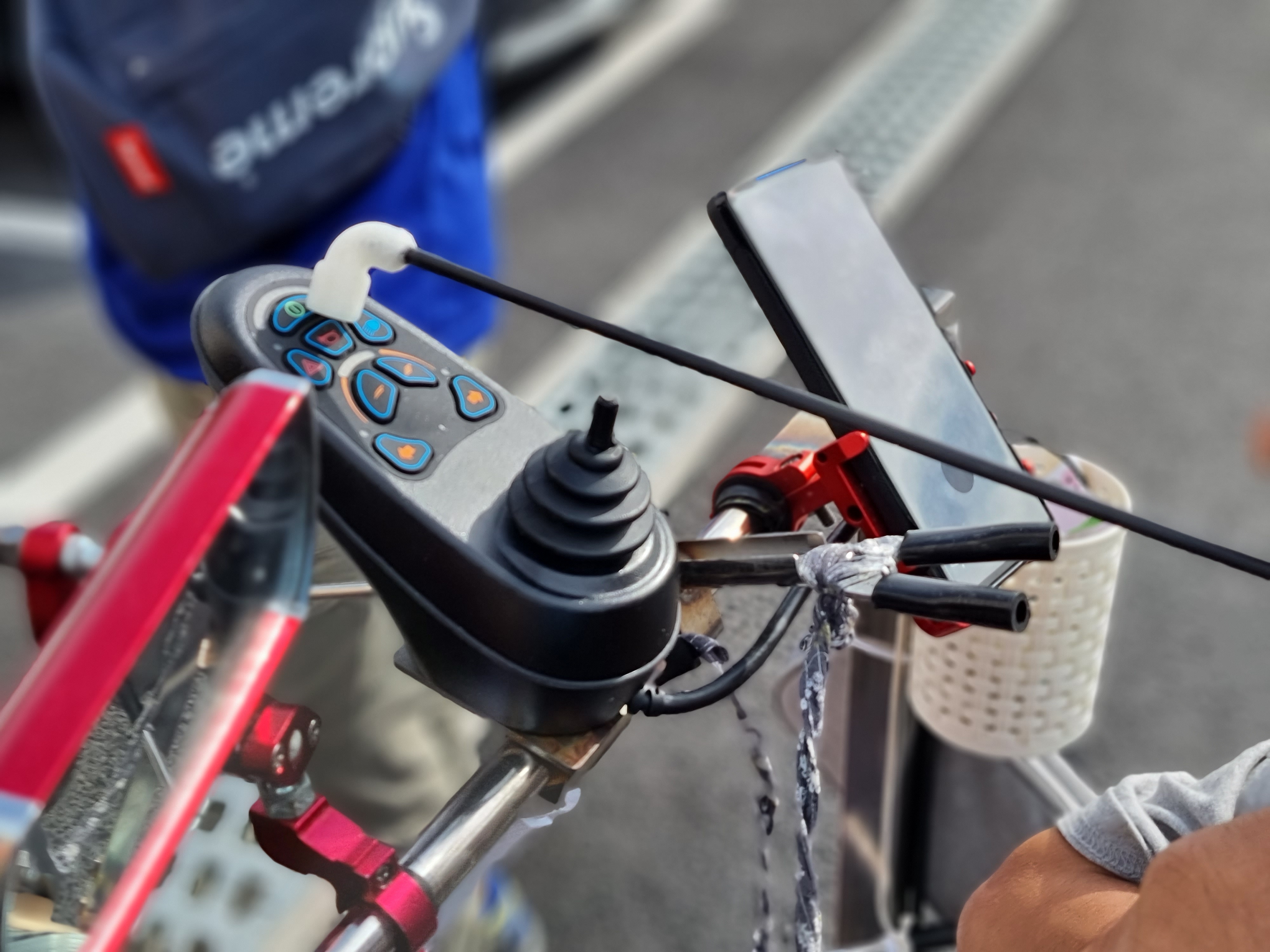 부드러운 재질로 마우스 스틱을 제작하기 위해서 Flexible 재질로 Y형태의 입에 무는 부분을 제작하였으며, 의료용 무독성 실리콘 튜브를 덮어 마감하였음. 가운데의 지지대의 경우 무게와 강도를 모두 생각하여 카본 재질의 외경 6.5mm의 파이프로 제작하였으며, 전동휠체어의 조이스틱을 조정할 수 있는 ㄱ자 형의 제어부는 PLA재질로 제작하였음.
