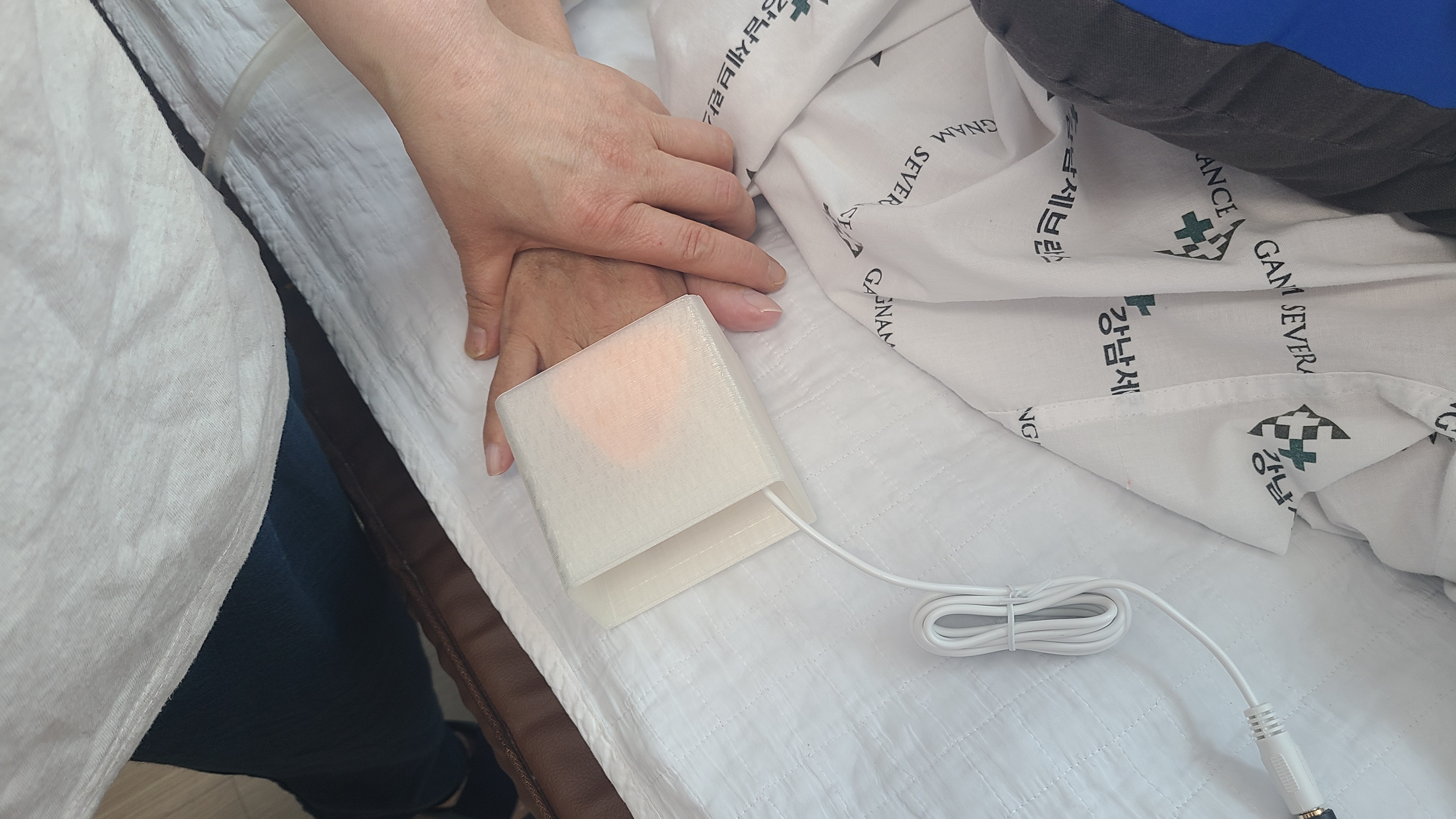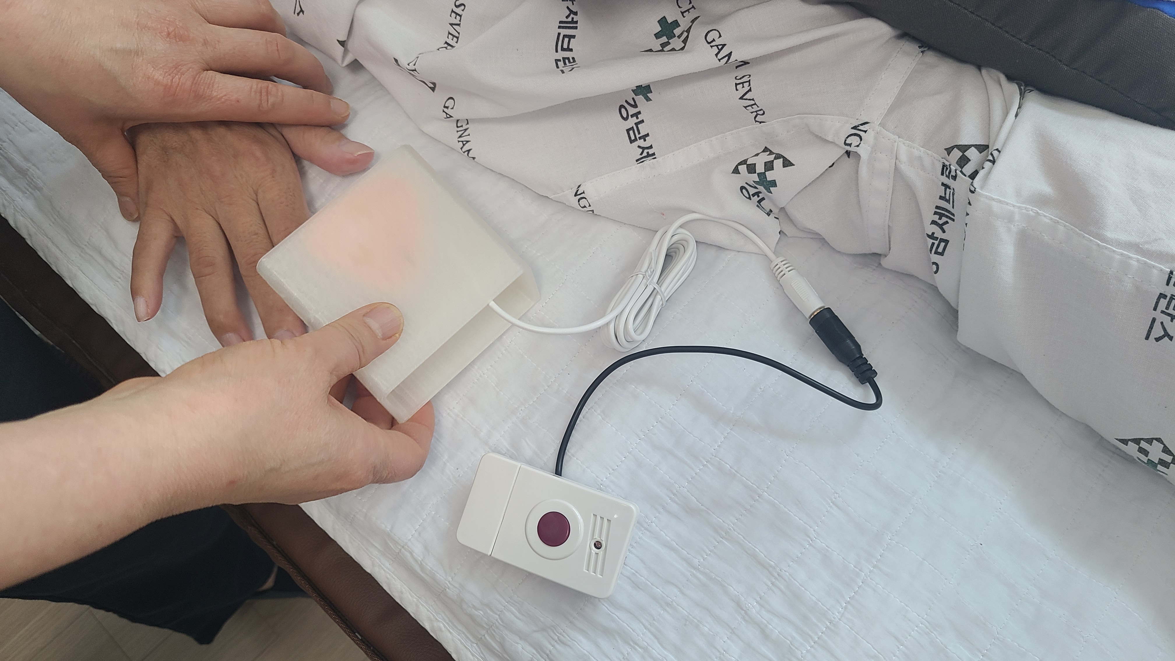 손바닥에 위치시켜 손의 위치를 변경하더라도 스위치를 사용하여 호출할 수 있는 사각형 형태의 거치대를 제작하였음. 루게릭 등으로 신체 근력이 떨어져 스위치를 누를 수 있는 힘이 매우 부족한 대상자를 위해서 약간의 움직임으로 선택할 수 있는 근접센서 스위치를 사용하였으며 손가락을 약간만 들더라도 스위치를 선택할 수 있도록 하였음. 근접센서 스위치를 사각형의 거치대 윗쪽에 부착한 후 손바닥을 사각통에 넣어서 사용하며 손가락을 들었을 때 스위치를 선택하여 호출할 수 있는 환경을 구축하여 활용하도록 하였음
