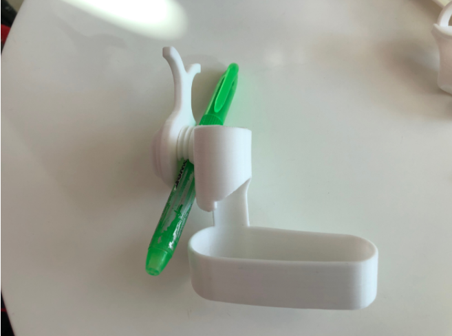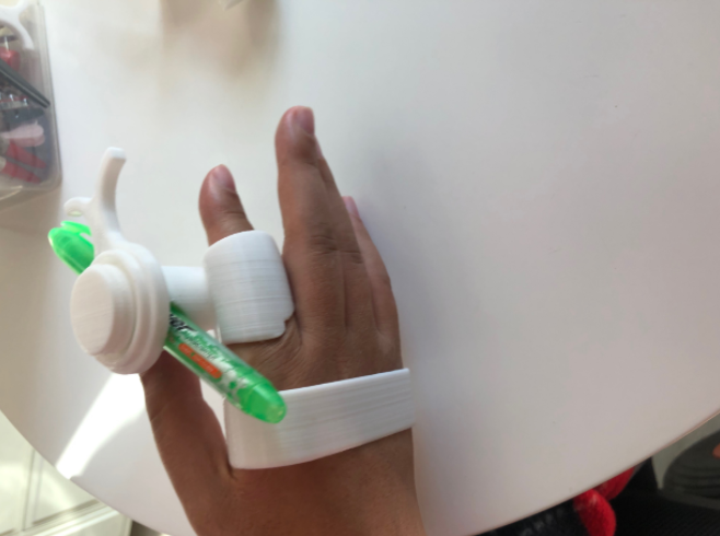 1. 신체상태 - 낙상으로 인한 경추 5-6번 손상으로 2006년도에 지체 장애 1급을 판정 받았으며, 최초 장애 판정 당시 만 나이는 30세였음. - 언어 및 인지, 감각 : 문제없음. / 신체 : 상하지 모두 마비로 사용에 어려움이 있음. 특히, 하지는 수의적인 움직임이 불가능하며, 상지는 어깨와 팔의 움직임은 가능하나 손가락의 움직임에 어려움이 있음. 2. 제한사항 - 대상자가 현재 사용하고 있는 학습보조기기인 필기보조도구(손바닥용)은 굵기가 다른 여러 종류의 필기구를 사용할 수 있게 제작되지 않아. 한 종류의 필기구만 사용이 가능함. 3. 요구사항 (제작형태) - 여러 종류의 필기도구를 수용할 수 있는 보조기기여야하며,거치대는 손바닥과 손등에 고정하여 사용할 수 있도록 제작하여야 하며, 필기구의 사용은 검지손가락으로 하고 있음. 다양한 굵기의 필기구를 고정시킬 수 있도록 제작해줄 것을 요구함. - 손바닥 치수 (넓이 : 7.5cm, 높이 : 2.6cm, 길이 : 7cm, 둘레 : 5.5cm) 4. 제작 기존에 사용하던 필기보조기기가 가장 편하고 적합하다고 판단하여 최대한 응용하여 제작. 대상자의 욕구에 맞춰 여러종류의 필기구를 사용할 수 있도록 구멍을 크게 제작함. 손가락 및 손목 굽힘이 제한되어 있는 대상자도 쉽게 간격을 조절할 수 있도록 손잡이부분 제작. 그리고 손가락을 받칠 수 있도록 제작함. |