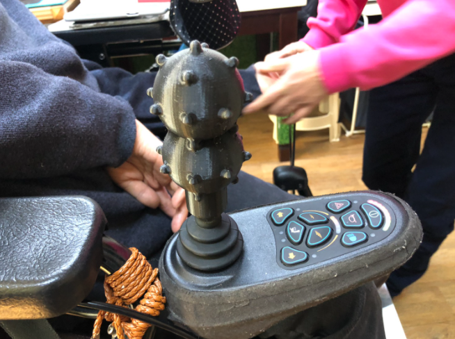 - 출생시에 의료사고로 인하여 뇌 손상을 입음. 이와 같은 이유로 선천적인 장애를 가졌으나, 최초 장애 판정은 시간이 지난 후인 2000년도에 받음. - 언어 : 뇌 손상으로 인한 마비말장애로 말하는 속도가 느리고, 힘이 들어가 있으며, 막힘 현상이 발생함. 신체 : 경직형 마비로 경직에 의해 팔다리가 뻣뻣하고 관절의 사용에 제한이 있음. 또한, 과도한 근육 긴장으로 인하여 수의적인 움직임이 어려움. - 경직형 마비로 인해 신체의 근긴장도가 높아 불수의적 운동이 자주 나타남. 전동휠체어 탑승 시에 양측 팔의 팔꿈치관절이 수축이 심하여 조이스틱으로부터 손을 놓치는 경우가 많음. 이를 방지하고자 돌기가 있는 도깨비 방망이의 형태를 요구하였음. - 구를 두개 삽입하여 구 주위를 패턴효과로 돌기를 제작한 뒤, 구 두개를 합치고 기둥을 삽입하여 모델링하였음. - 손잡이를 사용해본 결과, 조이스틱 손잡이가 미끌리는 일이 거의 발생하지 않았고 잘 사용하고 있다고 함. |