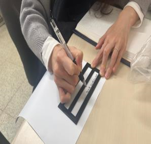 우측 시력은 전맹인 상태이고 좌측 시력 기능만 일부 남아있는 시각장애인입니다. 큰 글씨 등 확대 글씨는 판독할 수 있지만, 평소 필기 등 손 글씨를 쓸 때 글씨가 일정한 높이로 쓰이지 않고 위나 아래로 삐뚤어지게 쓰여 제가 쓴 글씨를 확대해서 보기 어려움을 겪고 있었습니다. 처음에는 간단한 서명, 단어 등을 편하게 사용할 수 있는 ‘시각장애인용 서명판‘을 제작 요청하였고 제작 후 ’시각장애인용 서명판‘을 이용하여 서류 등에 서명을 하거나 간단한 단어 등을 쓸 때 굉장히 유용하게 사용하곤 했습니다.