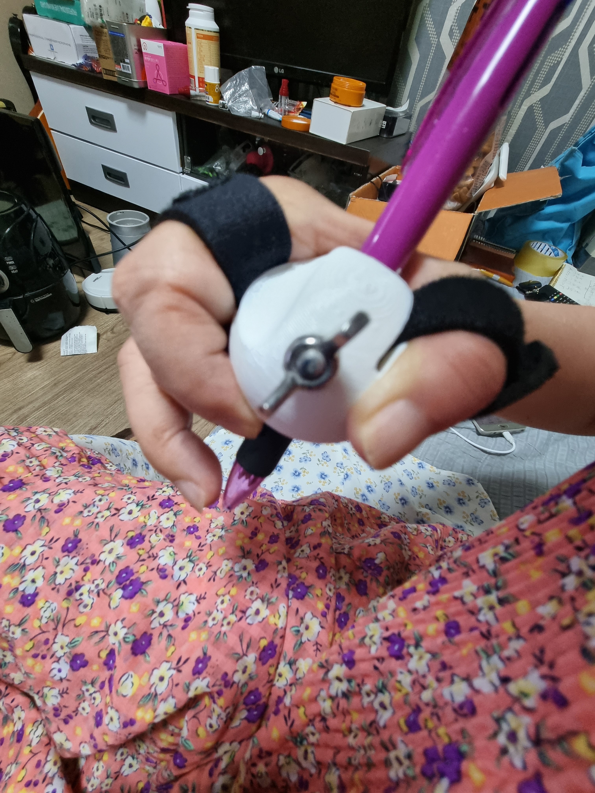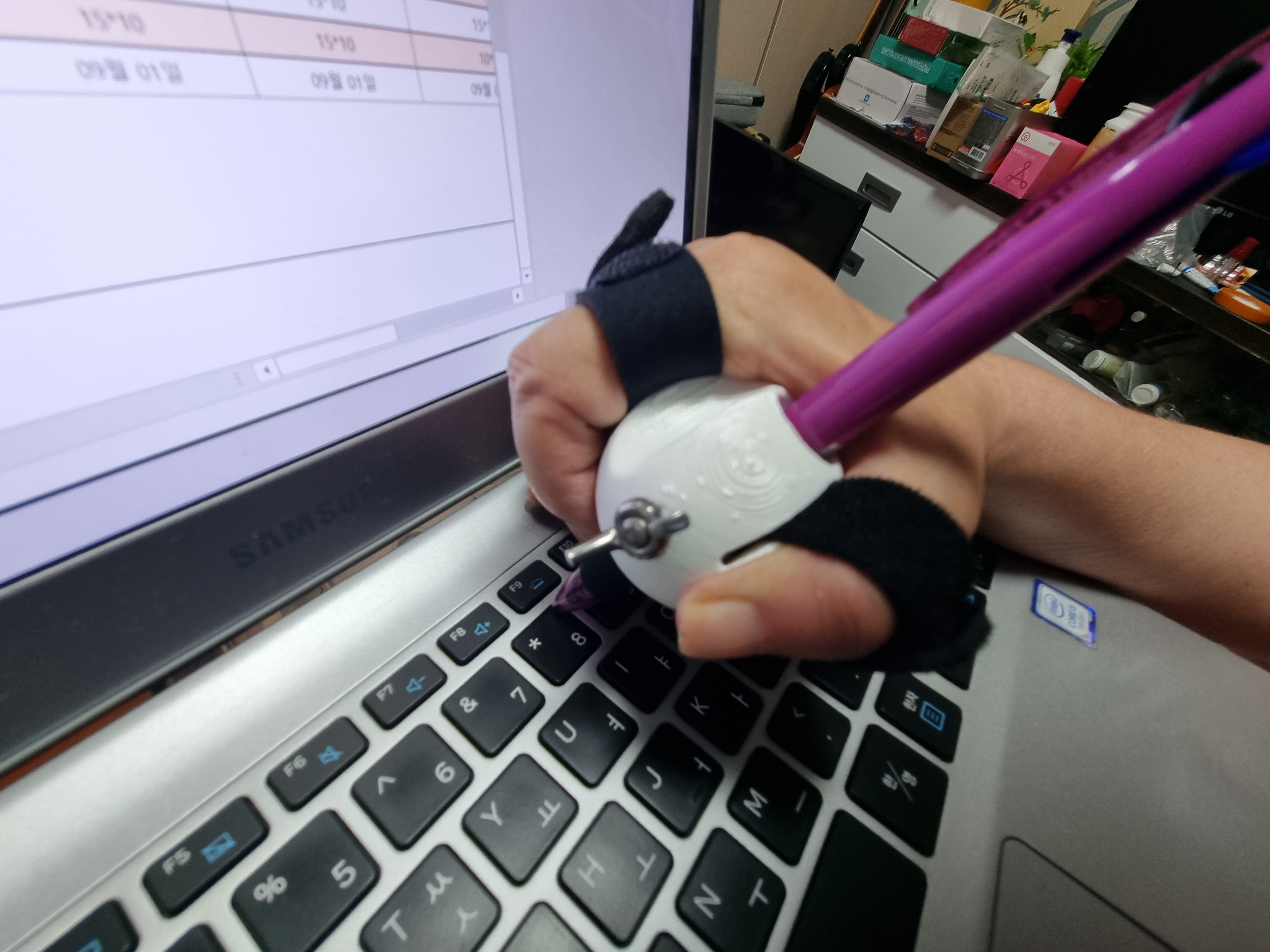 저는 뇌출혈로 인한 우측 편마비로 오른손을 사용하는 것에 불편함을 항상 가지고 있었습니다. 특히 펜을 쥐고 글씨를 쓰고 키보드를 누르는 방법을 어떻게 하면 편하게 할지 항상 고민을 가지고 있었습니다. 그러던 중 누림센터에 교육을 받으러 방문하게 되었는데 경기도재활공학센터에 전시되어 있는 3D 프린터로 제작된 필기 보조기기를 발견하게 되었고 이것을 사용한다면 가능성이 있지 않을까 생각하게 되었습니다. 전시된 기기를 사용해 보고 제작을 담당하는 선생님께 빠지지 않도록 손가락에 고정할 수 있는 밴드를 꼭 추가해달라고 요청드렸고 2주 뒤 택배로 보조기기를 받아볼 수 있었습니다. 공 모양으로 제작된 보조기기는 오른손에 쏙 들어와서 평소 펜을 그냥 잡는 것보다 훨씬 잡기에 편했습니다. 자판을 찍을 때 쓰지 않던 손을 쓰려고 하니 어색하고 잘되지 않을 때가 있었지만 그것은 저의 문제이고, 확실히 오른손을 쓰지 못하고 아무것도 하지 못할 때의 불편함 보다 오른손을 사용해 양손을 협력할 때 활용도가 두 배가 되어 매우 만족합니다. 좋은 아이디어로 보조기기를 제작해 주셔서 감사합니다. |