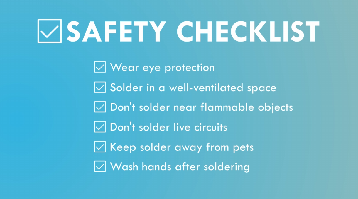 전자기기 제작이나 수리의 첫걸음은 언제나 ‘안전’입니다. 다음의 여섯 가지는 납땜 작업 전 반드시 점검해야 할 기본 체크리스트입니다. ✅ 보호안경 착용하기 ✅ 환기가 잘되는 공간에서 작업하기 ✅ 가연성 물질 근처에서 납땜하지 않기 ✅ 전원이 연결된 회로에서 작업하지 않기 ✅ 애완동물, 어린이와 납을 멀리 두기 ✅ 작업 후 손 깨끗이 씻기