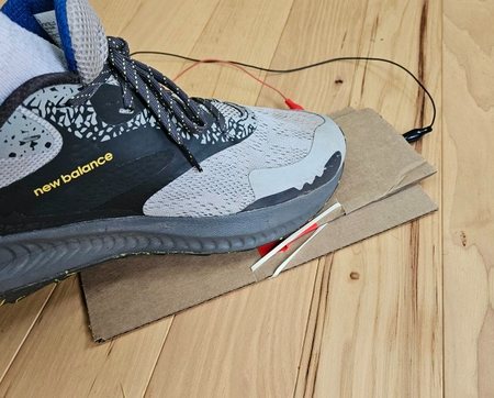 판지는 절연체이기 때문에, 평상시에는 두 알루미늄 포일 사이에 전기적 접촉이 없으며 이로 인해 스위치는 상시 개방 상태를 유지합니다. 위쪽 판지를 발로 눌러주면 두 알루미늄 포일 조각이 서로 닿으면서 스위치가 닫힙니다. 스위치에서 발을 떼면 고무줄이 판지를 원래 위치로 끌어당겨 다시 열린 상태로 돌아가며, 이로 인해 이 스위치는 토글 스위치가 아닌 모멘터리 스위치로 동작합니다.