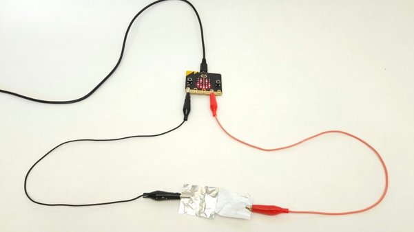 그림2. micro:bit 보드를 사용한 기본적인 전기 스위치의 시연 모습이다. 두 개의 알루미늄 포일 조각이 악어 클립을 통해 서로 다른 I/O 핀에 연결되어 있다. 두 조각이 서로 닿으면 micro:bit가 폐쇄 회로를 감지하고, LED로 웃는 얼굴을 표시한다.