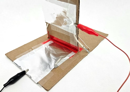 평상시에는 두 장의 종이가 약간 벌어진 곡선을 이루고 있어 알루미늄 포일 사이에 간격이 존재합니다. 종이를 아래로 누르면 이 간격이 닫히면서 두 알루미늄 포일이 서로 닿게 되고, 손을 떼면 종이가 다시 약간 휘어진 원래 형태로 되돌아가면서 간격이 다시 열립니다.