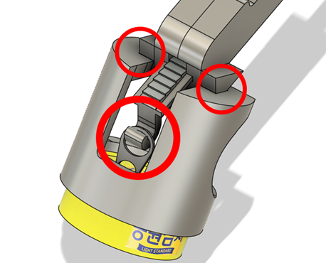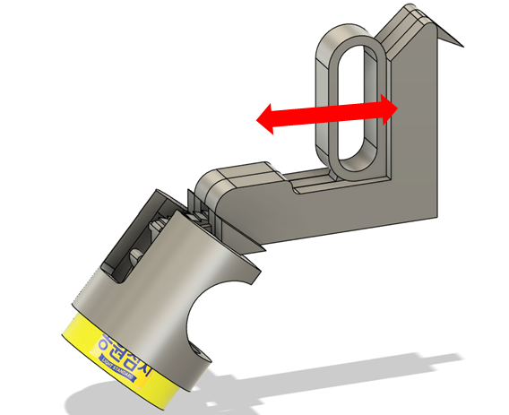 5. 위치 고정 본체 전면에 있는 두 쌍의 돌기를 캔 고정대 상단의 대응 구멍에 맞추어 끼운다. 이 단계에서 레일이 캔 고정대 안쪽으로 더 밀려들어 가며 ‘딸깍’ 소리가 나면서 길이가 자동으로 조정되고, 사용자가 별도의 힘을 들이지 않고도 최적의 위치에서 작동할 수 있다. 이때 통조림 손잡이의 크기와 각도에 따라 두 쌍의 돌기가 대응 구멍에 완전히 들어가지 않을 수도 있는데, 이후 개봉 동작을 수행하면서 자연스럽게 완전히 들어가 고정된다. | |