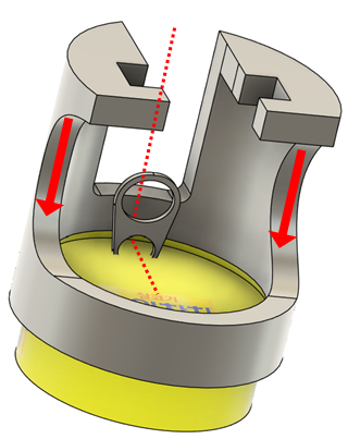 2. 캔 고정대 장착 세워둔 손잡이가 흔들리지 않도록, 캔 고정대를 통조림 상단에 덮어씌운다. 이를 통해 개봉 과정에서 캔이 안정적으로 고정된다. 이때 통조림 손잡이가 고정대 측면의 사각형 홈과 정확히 일치하도록 위치시키는 것이 중요하다. | |