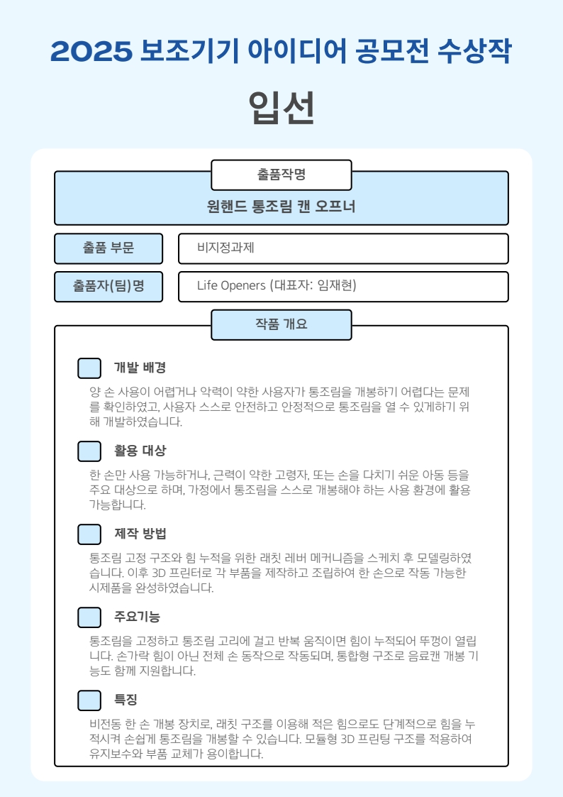 | 6. 개봉 동작 수행 한 손가락으로는 본체를 지지하고, 네 손가락으로는 타원 모형의 구멍을 넣어 손을 쥐었다 폈다를 반복한다. 해당 동작을 할 때마다 레일이 사용자의 쪽으로 조금씩 이동하며, 갈고리에 걸린 통조림 손잡이가 점진적으로 당겨진다. 반복적인 동작을 통해 힘이 분산되면서 통조림의 뚜껑이 안전하고 부드럽게 열리게 된다. | |