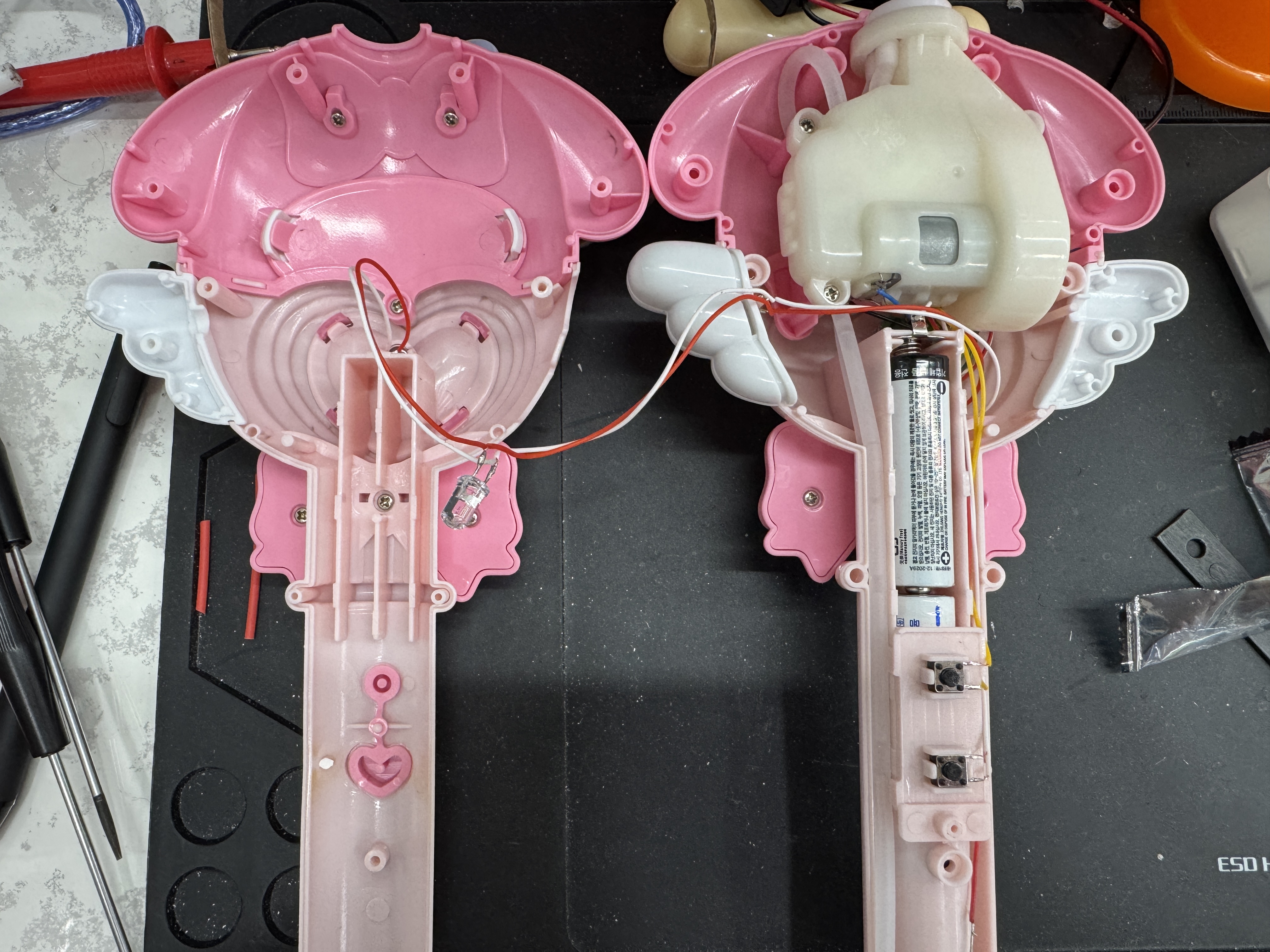먼저, 비눗방울 장난감의 내부 구조를 확인해보았습니다. 내부를 살펴보니 이 장난감 역시 단순 접점 스위치로 제작되어 있어, 강아지 장난감과 마찬가지로 버튼을 직접 누르지 않더라도 전원 신호만 전달하면 작동시킬 수 있는 구조라는 점을 확인할 수 있었습니다.