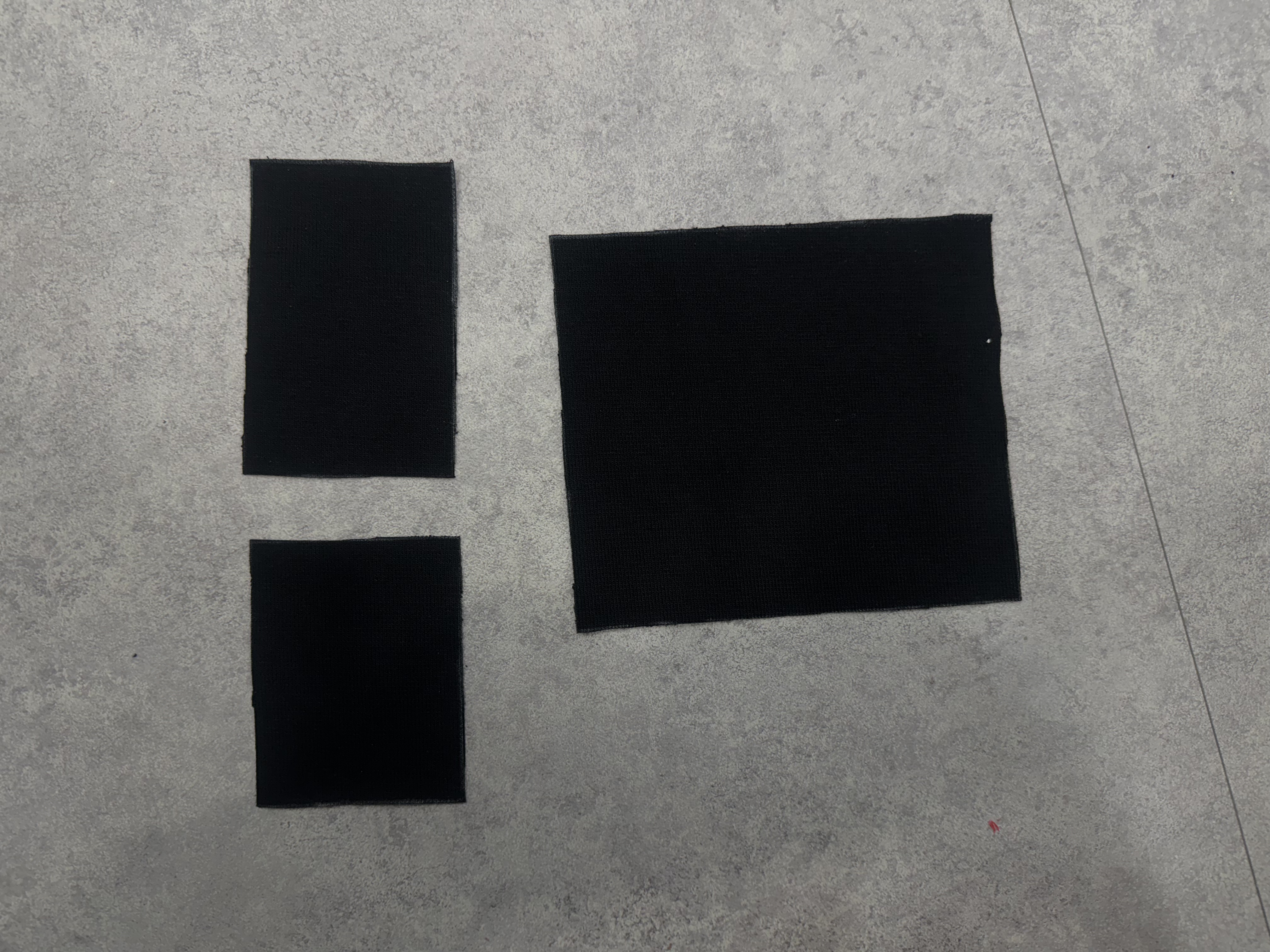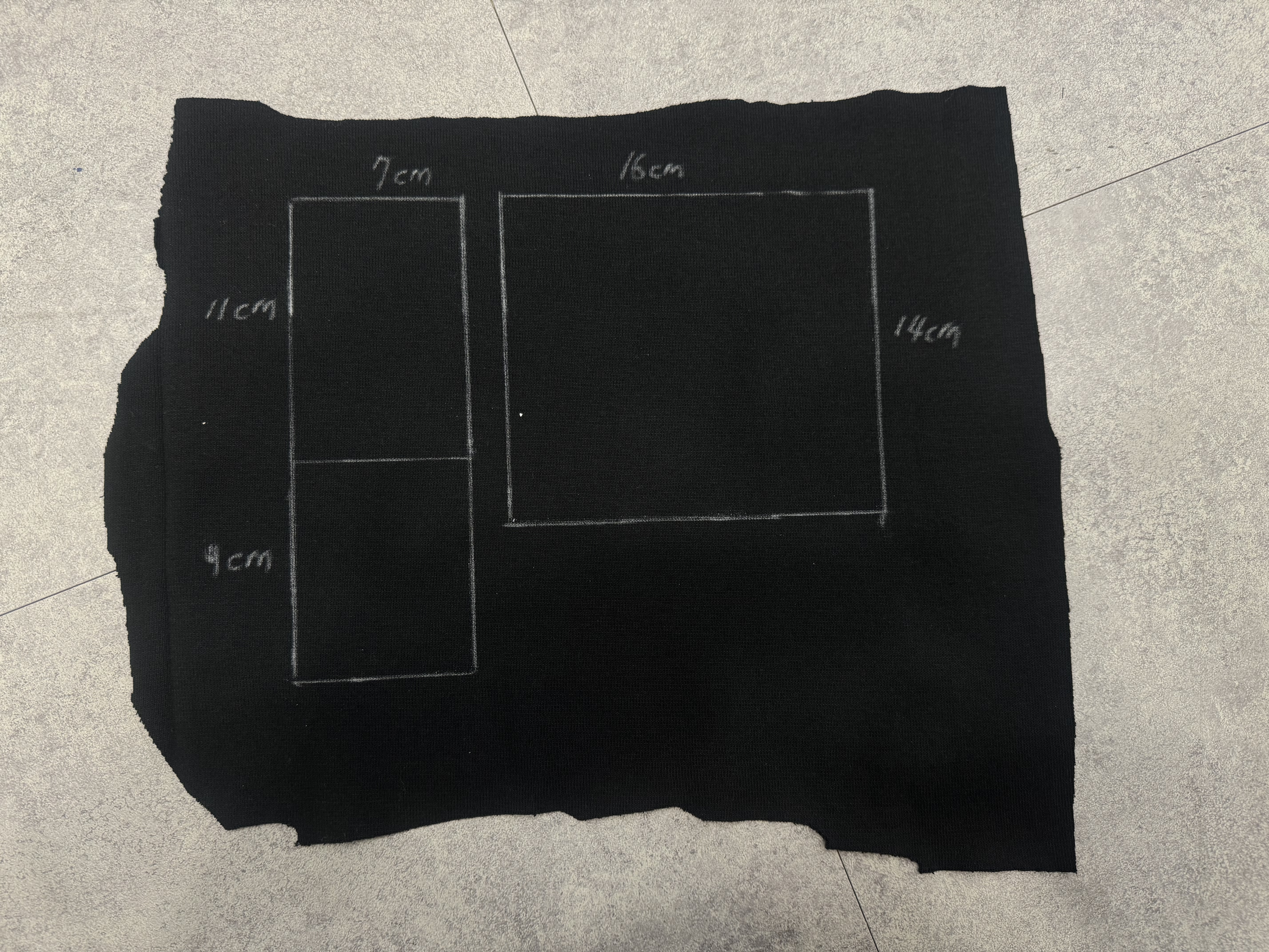 ③ 7cm×11cm 원단을 접어 미싱 후 16cm×14cm 원단 위에 7cm×9cm 원단과 함께 겹침